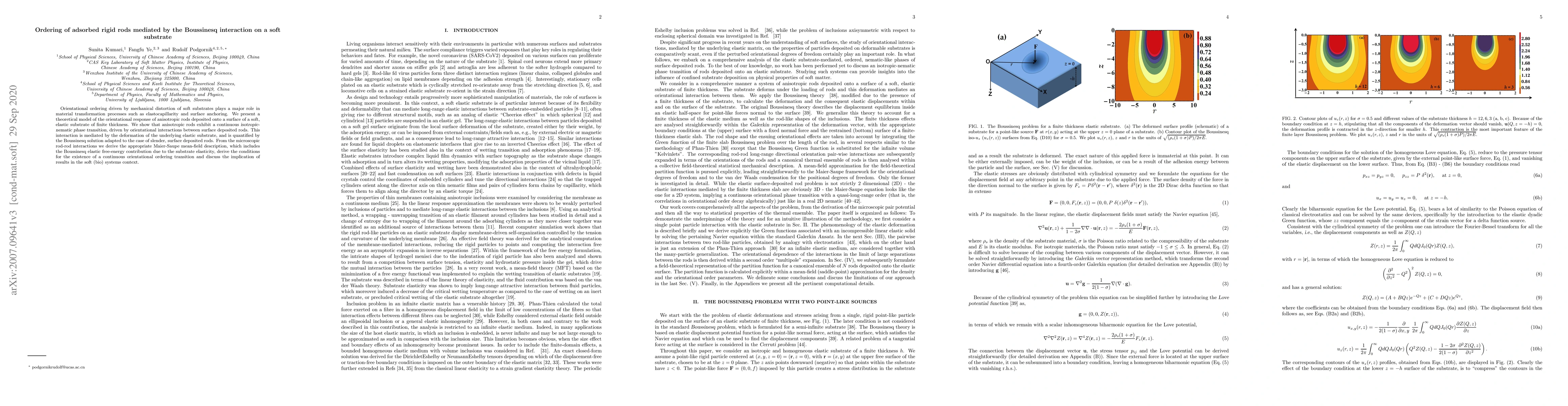 This paper presents a theoretical model explaining how anisotropic rods on a soft elastic substrate undergo an isotropic-nematic phase transition due to Boussinesq interaction mediated by substrate deformation, and discusses its implications for material transformation processes in soft systems.