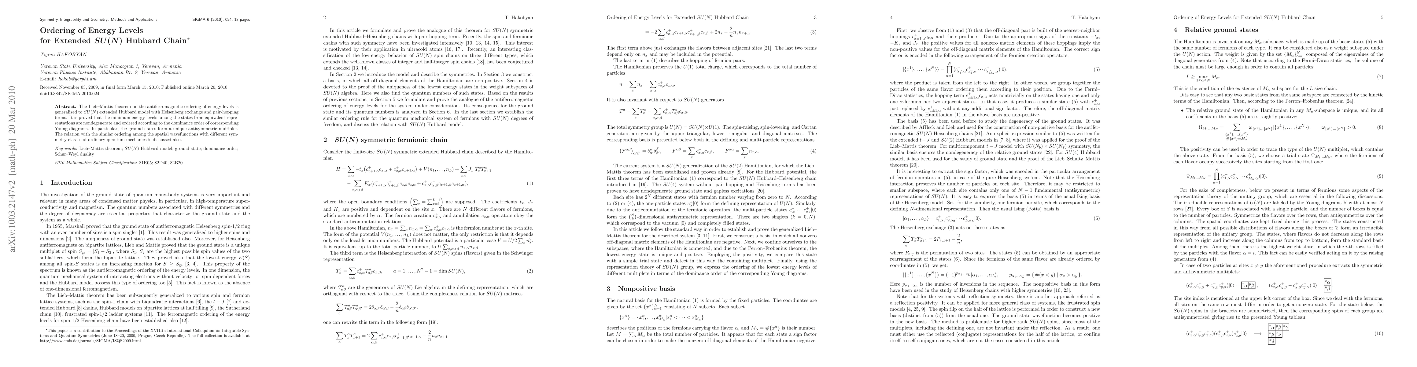This paper generalizes the Lieb-Mattis theorem to the SU(N) extended Hubbard model, proving that minimum energy levels are nondegenerate and ordered by the dominance of Young diagrams. The ground states form a unique antisymmetric multiplet, with a discussion on its relation to spatial wavefunction ordering in quantum mechanics.
