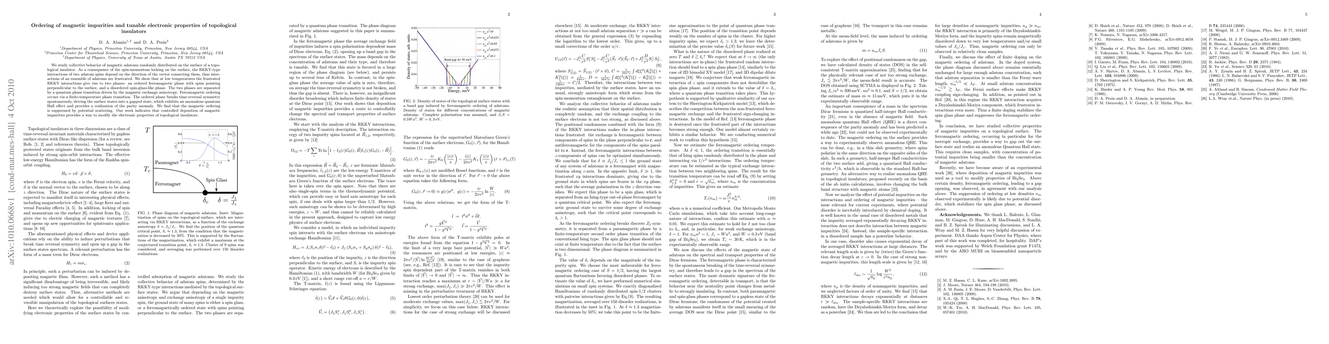 We study collective behavior of magnetic adatoms randomly distributed on the surface of a topological insulator. As a consequence of the spin-momentum locking on the surface, the RKKY-type interactions of two adatom spins depend on the direction of the vector connecting them, thus interactions of an ensemble of adatoms are frustrated. We show that at low temperatures the frustrated RKKY interactions give rise to two phases: an ordered ferromagnetic phase with spins pointing perpendicular to the surface, and a disordered spin-glass-like phase. The two phases are separated by a quantum phase transition driven by the magnetic exchange anisotropy. Ferromagnetic ordering occurs via a finite-temperature phase transition. The ordered phase breaks time-reversal symmetry spontaneously, driving the surface states into a gapped state, which exhibits an anomalous quantum Hall effect and provides a realization of the parity anomaly. We find that the magnetic ordering is suppressed by potential scattering. Our work indicates that controlled deposition of magnetic impurities provides a way to modify the electronic properties of topological insulators.