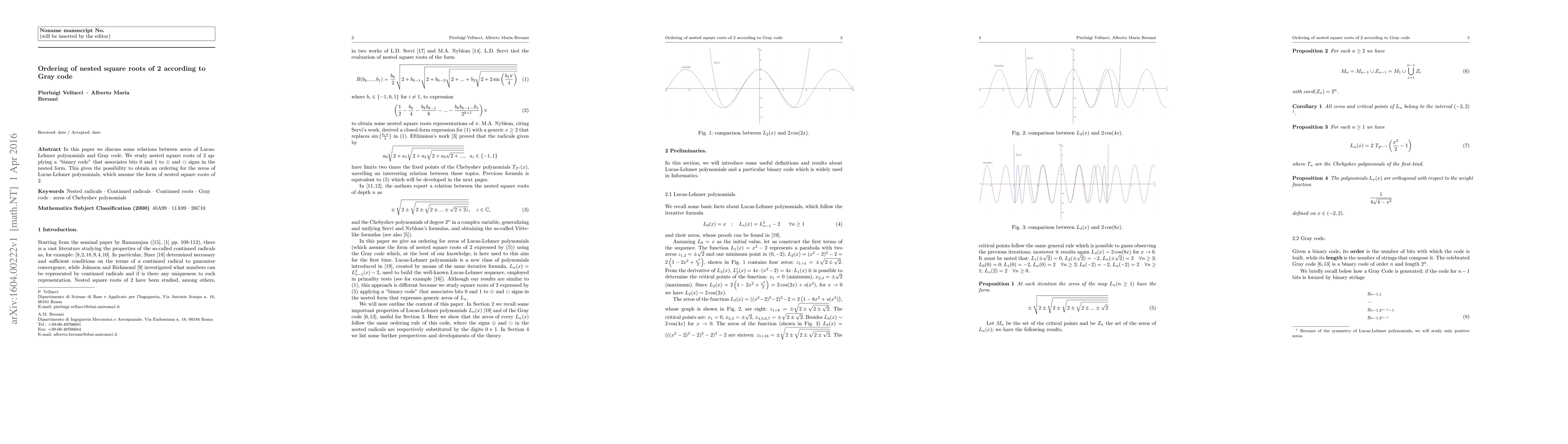 This paper explores the relationship between zeros of Lucas-Lehmer polynomials and Gray code, using a binary code to order nested square roots of 2, which correspond to these zeros. The study employs a binary system associating bits to specific signs to achieve this ordering.