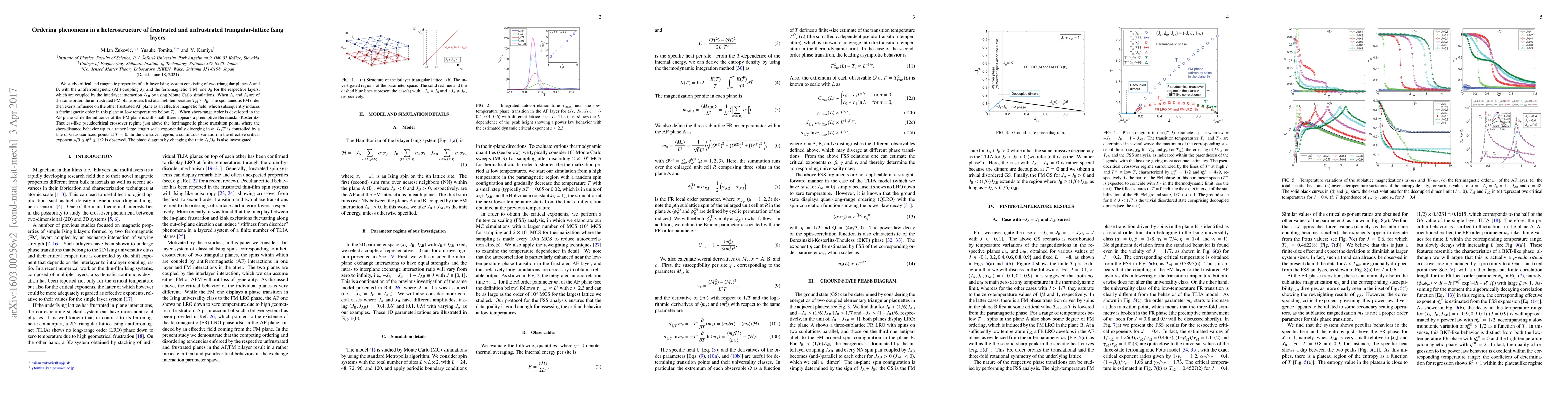 We study critical and magnetic properties of a bilayer Ising system consisting of two triangular planes A and B, with the antiferromagnetic (AF) coupling $J_{\rm A}$ and the ferromagnetic (FM) one $J_{\rm B}$ for the respective layers, which are coupled by the interlayer interaction $J_{\rm AB}$ by using Monte Carlo simulations. When $J_{\rm A}$ and $J_{\rm B}$ are of the same order, the unfrustrated FM plane orders first at a high temperature $T_{c1} \sim J_{\rm B}$. The spontaneous FM order then exerts influence on the other frustrated AF plane as an effective magnetic field, which subsequently induces a ferrimagnetic order in this plane at low temperatures below $T_{c2}$. When short-range order is developed in the AF plane while the influence of the FM plane is still small, there appears a preemptive Berezinskii-Kosterlitz-Thouless-like pseudocritical crossover regime just above the ferrimagnetic phase transition point, where the short-distance behavior up to a rather large length scale exponentially diverging in $\propto \JA / T$ is controlled by a line of Gaussian fixed points at $T = 0$. In the crossover region, a continuous variation in the effective critical exponent $4/9 \lesssim \eta^{\rm eff} \lesssim 1/2$ is observed. The phase diagram by changing the ratio $J_{\rm A}/J_{\rm B}$ is also investigated.