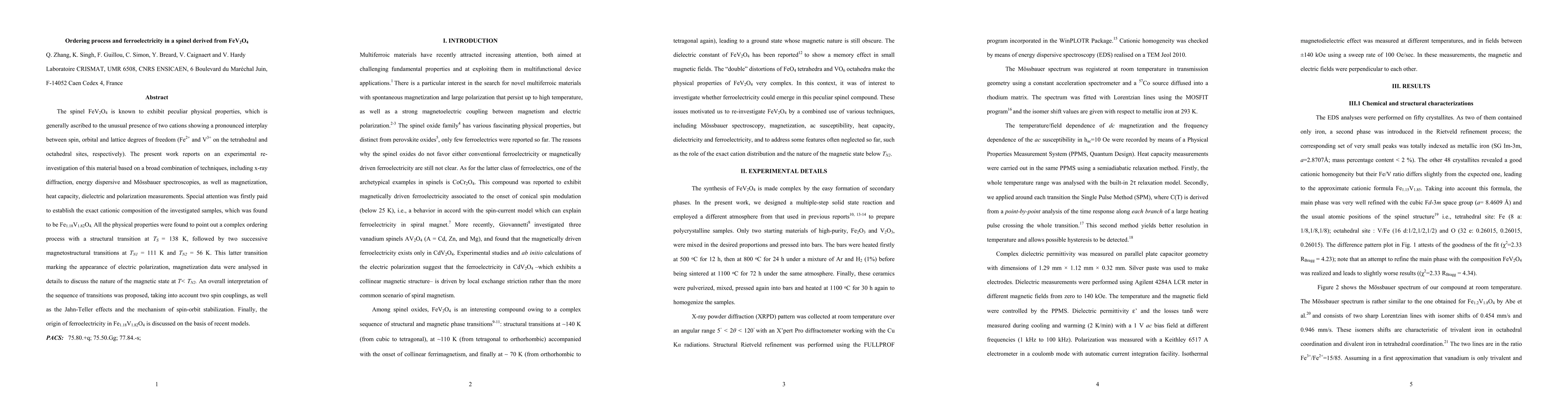 This study re-examines FeV2O4, finding its composition to be Fe1.18V1.82O4. It reveals a complex ordering process with structural and magnetostructural transitions at 138K, 111K, and 56K, with the latter causing electric polarization. The magnetic state below 56K and the origin of ferroelectricity are discussed, considering spin couplings, Jahn-Teller effects, and spin-orbit stabilization.