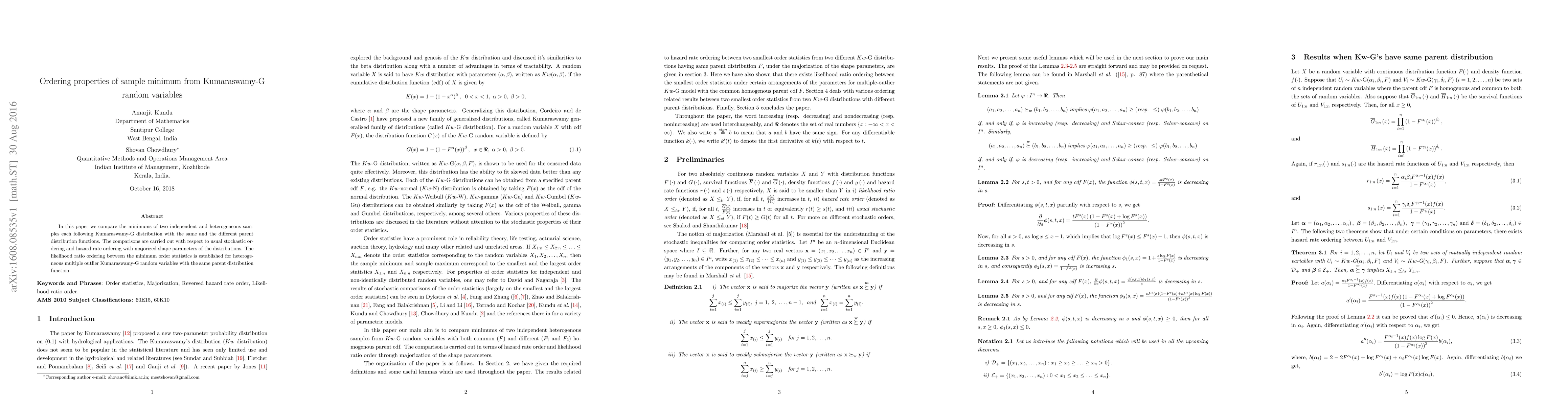 This paper compares minimums of Kumaraswamy-G random variables from different samples with varying parent distributions, establishing ordering properties using stochastic and hazard rate orderings.