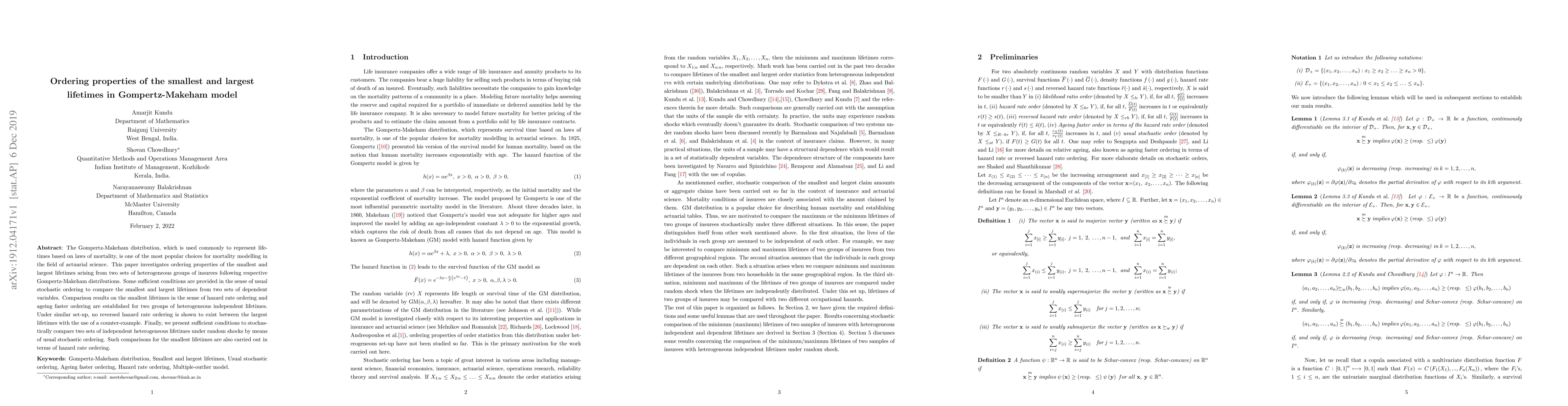 This paper investigates ordering properties of lifetimes in Gompertz-Makeham distributions for heterogeneous groups of insurees, finding sufficient conditions for comparing smallest and largest lifetimes under different orderings.