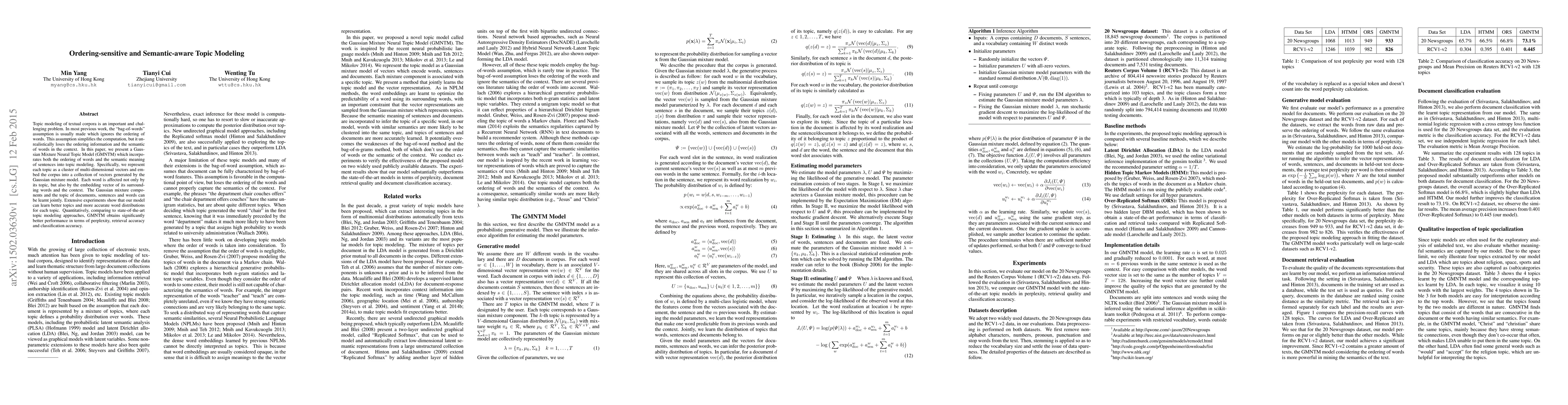 This paper introduces a Gaussian Mixture Neural Topic Model (GMNTM) that considers word ordering and semantic context in topic modeling, achieving better performance in perplexity, retrieval, and classification accuracy compared to traditional "bag-of-words" methods. The model jointly learns Gaussian mixture components and topic distributions, enhancing topic modeling accuracy.