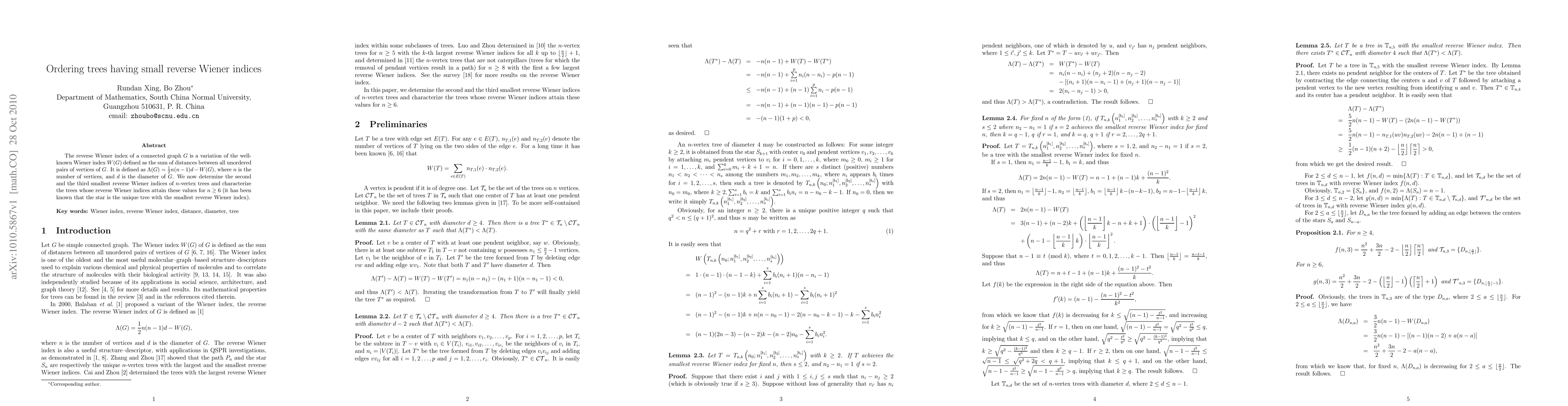 The reverse Wiener index of a connected graph $G$ is a variation of the well-known Wiener index $W(G)$ defined as the sum of distances between all unordered pairs of vertices of $G$. It is defined as $\Lambda(G)=\frac{1}{2}n(n-1)d-W(G)$, where $n$ is the number of vertices, and $d$ is the diameter of $G$. We now determine the second and the third smallest reverse Wiener indices of $n$-vertex trees and characterize the trees whose reverse Wiener indices attain these values for $n\ge 6$ (it has been known that the star is the unique tree with the smallest reverse Wiener index).