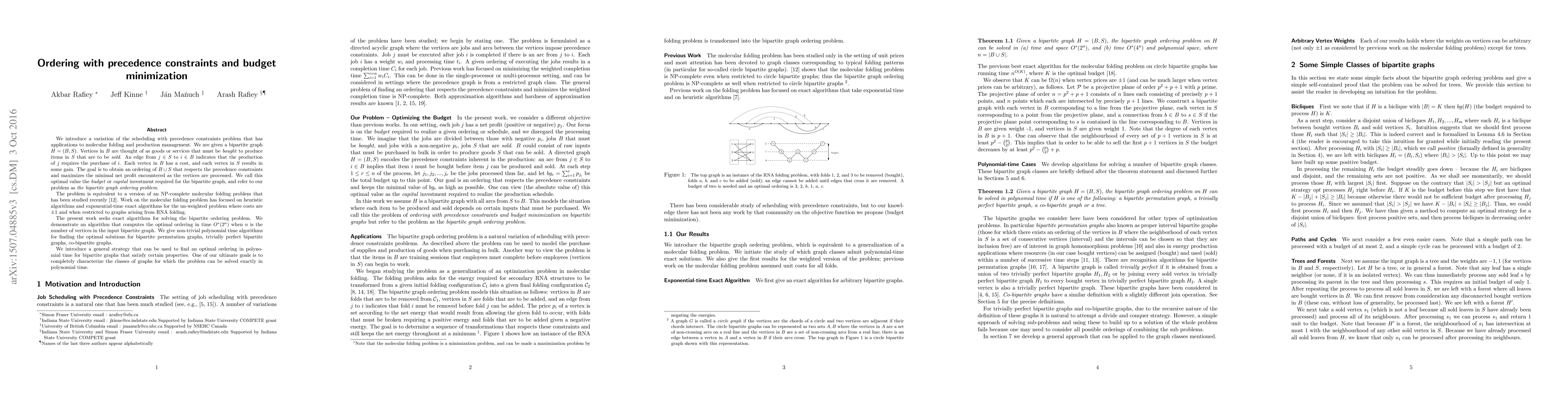 The paper introduces a variation of the scheduling problem with precedence constraints, applicable to molecular folding and production management, modeled as a bipartite graph H = (B, S). It aims to find an optimal ordering of B ∪ S that respects precedence constraints and maximizes minimal net profit.