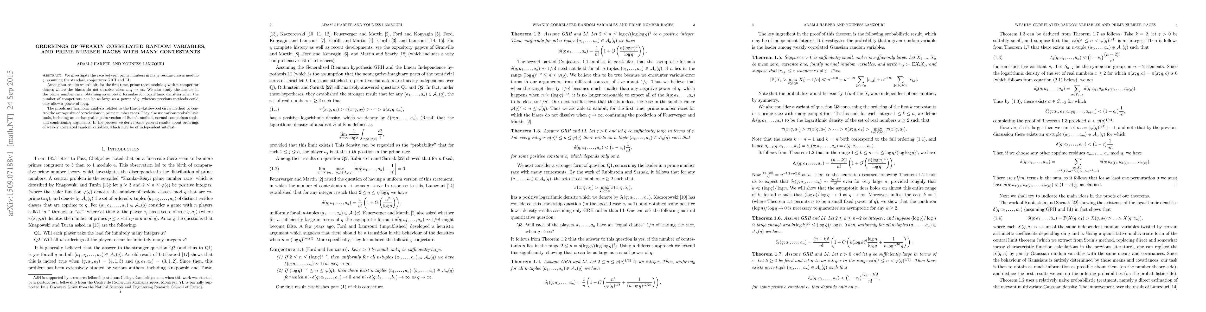 This paper explores prime number races in many residue classes under the conjectures GRH and LI, revealing persistent biases even with many competitors. It introduces new asymptotic formulae for logarithmic densities in prime races, significantly extending previous methods, and employs harmonic analysis and probabilistic tools to derive results on orderings of weakly correlated random variables.