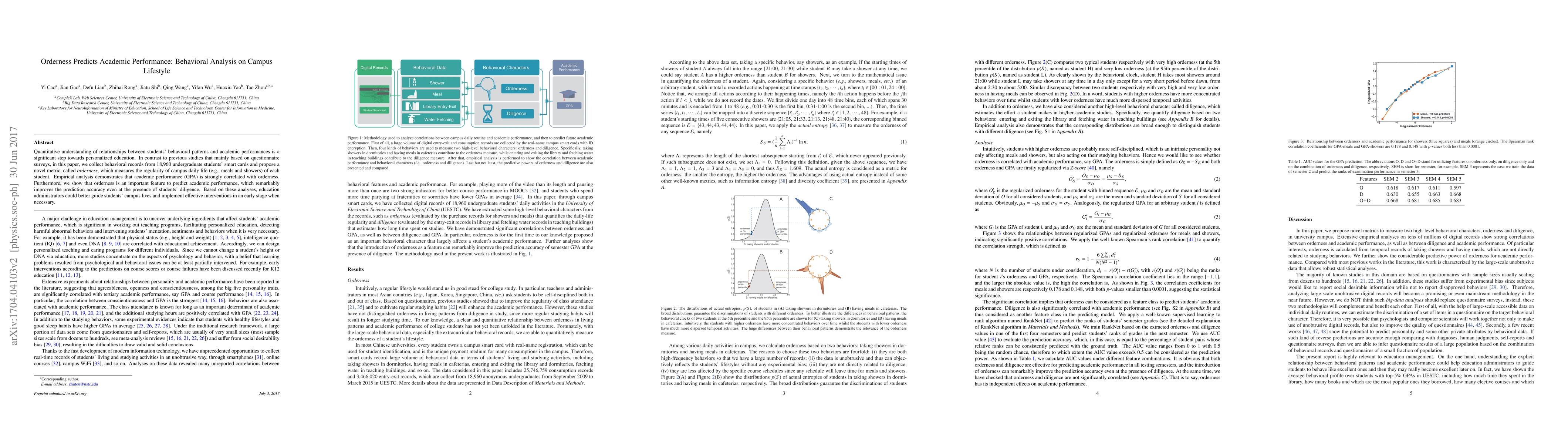 This study analyzes behavioral patterns of 18,960 undergraduate students using smart card data to introduce a new metric called orderness, which measures the regularity of daily campus activities. Findings reveal a strong correlation between orderness and academic performance, suggesting it can improve predictions of GPA even when accounting for student diligence.