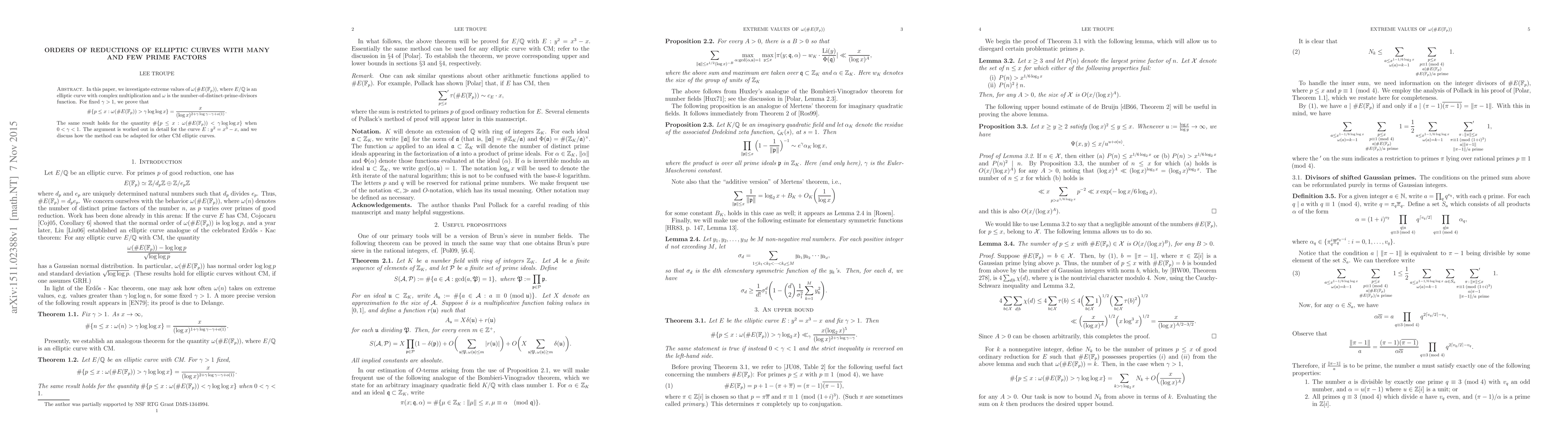 In this paper, we investigate extreme values of $\omega(E(\mathbb{F}_p))$, where $E/\mathbb{Q}$ is an elliptic curve with complex multiplication and $\omega$ is the number-of-distinct-prime-divisors function. For fixed $\gamma > 1$, we prove that \[ \#\{p \leq x : \omega(E(\mathbb{F}_p)) > \gamma\log\log x\} = \frac{x}{(\log x)^{2 + \gamma\log\gamma - \gamma + o(1)}}. \] The same result holds for the quantity $\#\{p \leq x : \omega(E(\mathbb{F}_p)) < \gamma\log\log x\}$ when $0 < \gamma < 1$. The argument is worked out in detail for the curve $E : y^2 = x^3 - x$, and we discuss how the method can be adapted for other CM elliptic curves.