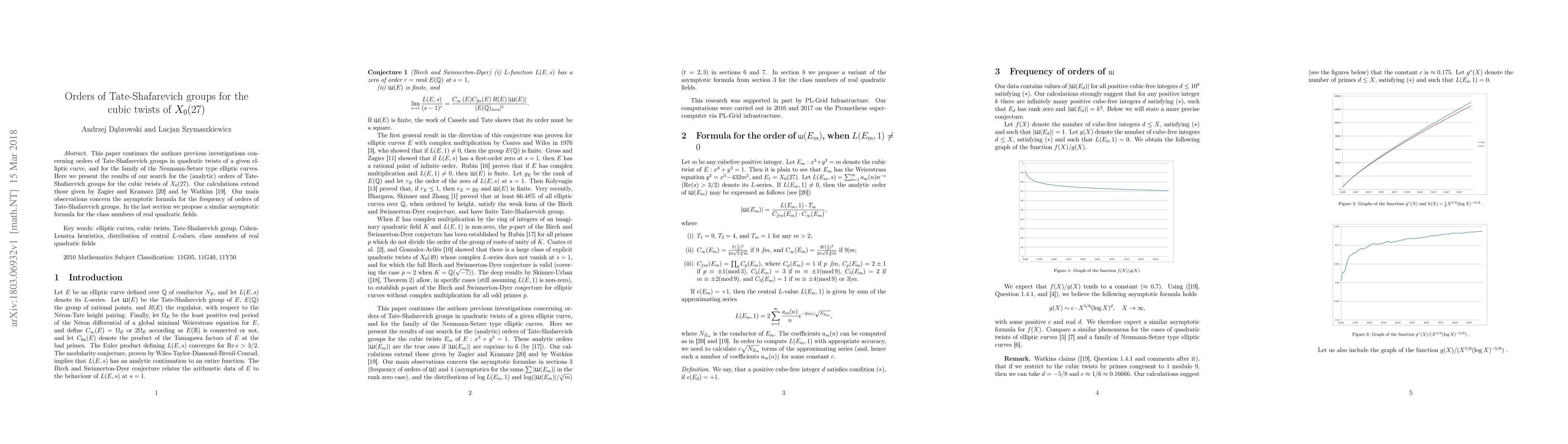 This paper continues the authors previous investigations concerning orders of Tate-Shafarevich groups in quadratic twists of a given elliptic curve, and for the family of the Neumann-Setzer type elliptic curves. Here we present the results of our search for the (analytic) orders of Tate-Shafarevich groups for the cubic twists of $X_0(27)$. Our calculations extend those given by Zagier and Kramarz \cite{ZK} and by Watkins \cite{Wat}. Our main observations concern the asymptotic formula for the frequency of orders of Tate-Shafarevich groups. In the last section we propose a similar asymptotic formula for the class numbers of real quadratic fields.