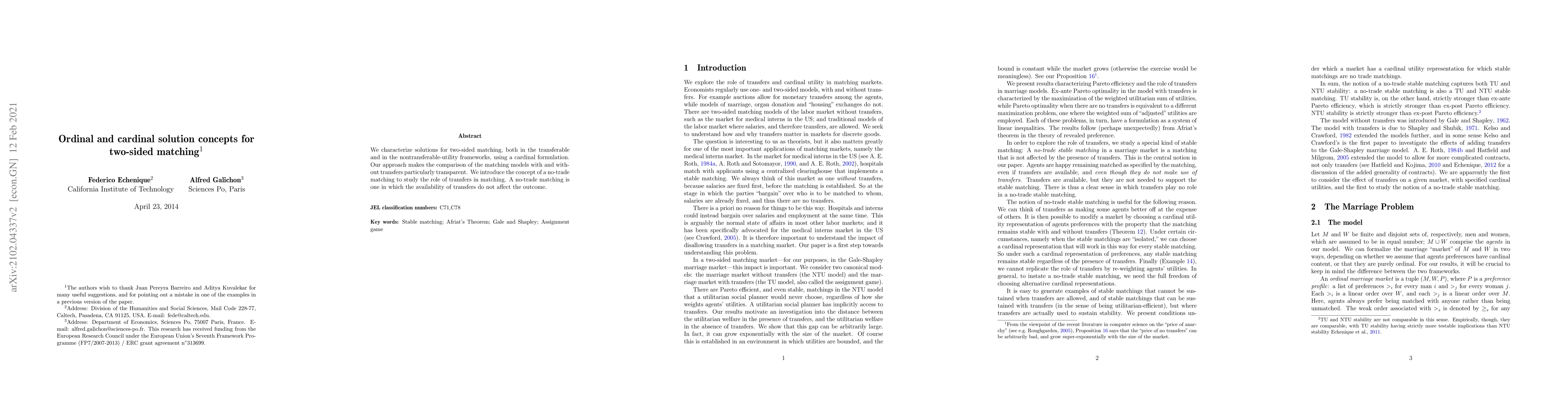 The paper uses a cardinal formulation to characterize solutions for two-sided matching, both in transferable and nontransferable utility frameworks. It introduces the concept of a no-trade matching to study the role of transfers in matching.
