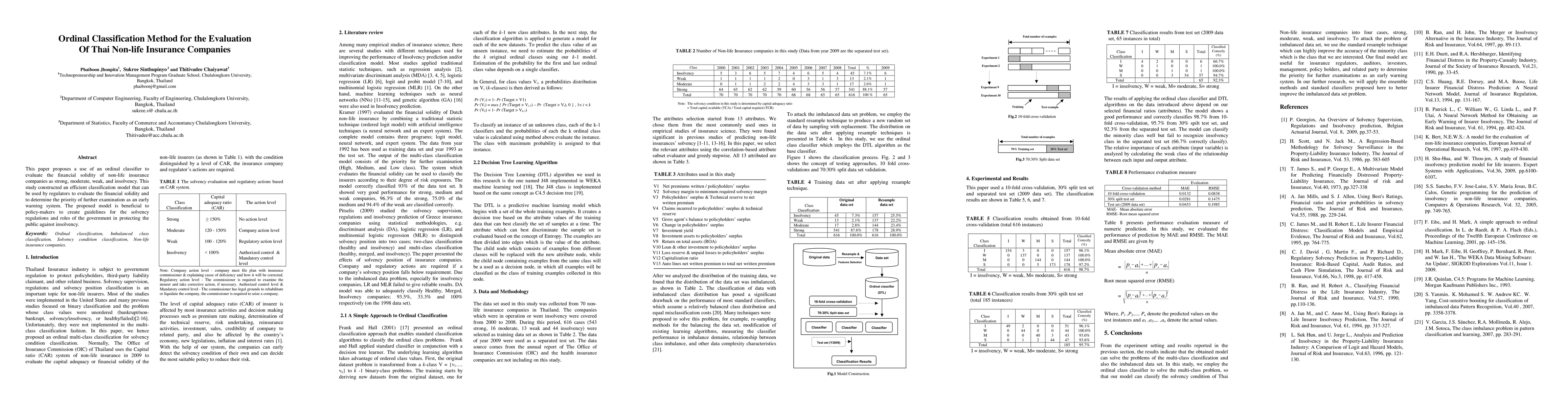 This paper introduces an ordinal classification method to evaluate the financial solidity of Thai non-life insurance companies, categorizing them into strong, moderate, weak, and insolvency. The proposed model aids regulators in prioritizing examinations and informs policy-making for solvency regulations.