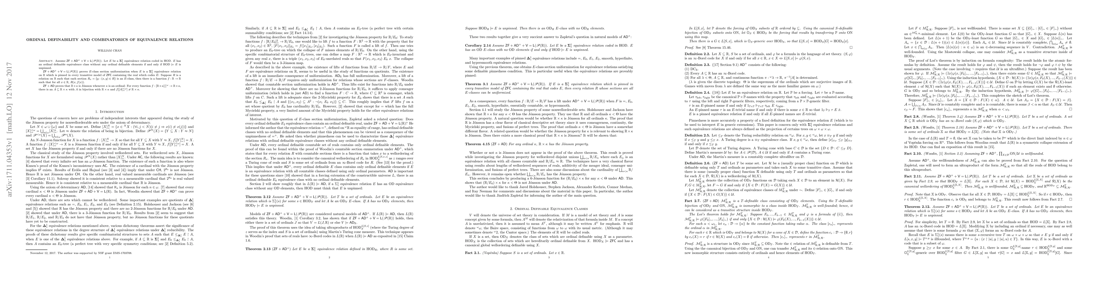 Assume $\mathsf{ZF + AD^+ + V = L(\mathscr{P}(\mathbb{R}))}$. Let $E$ be a $\mathbf{\Sigma}^1_1$ equivalence relation coded in $\mathrm{HOD}$. $E$ has an ordinal definable equivalence class without any ordinal definable elements if and only if $\mathrm{HOD} \models E$ is unpinned. $\mathsf{ZF + AD^+ + V = L(\mathscr{P}(\mathbb{R}))}$ proves $E$-class section uniformization when $E$ is a $\mathbf{\Sigma}^1_1$ equivalence relation on $\mathbb{R}$ which is pinned in every transitive model of $\mathsf{ZFC}$ containing the real which codes $E$: Suppose $R$ is a relation on $\mathbb{R}$ such that each section $R_x = \{y : (x,y) \in R\}$ is an $E$-class, then there is a function $f : \mathbb{R} \rightarrow \mathbb{R}$ such that for all $x \in \mathbb{R}$, $R(x,f(x))$. $\mathsf{ZF + AD}$ proves that $\mathbb{R} \times \kappa$ is J\'onsson whenever $\kappa$ is an ordinal: For every function $f : [\mathbb{R} \times \kappa]^{<\omega}_= \rightarrow \mathbb{R} \times \kappa$, there is an $A \subseteq \mathbb{R} \times \kappa$ with $A$ in bijection with $\mathbb{R} \times \kappa$ and $f[[A]^{<\omega}_=] \neq \mathbb{R} \times \kappa$.