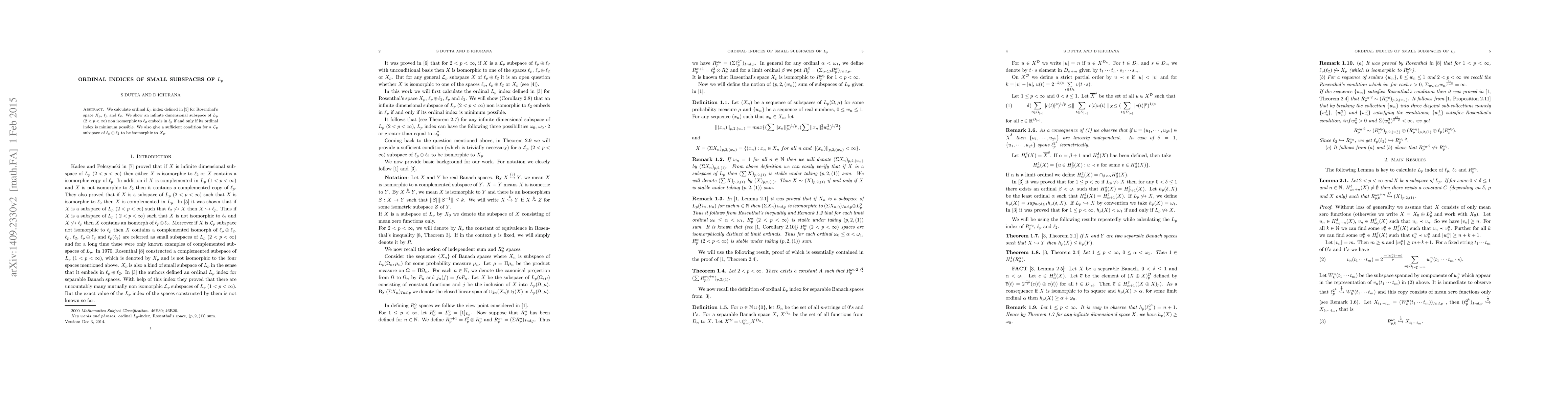 Researchers study ordinal L_p indices for small subspaces of L_p spaces, finding that a subspace non-isomorphic to ℓ_2 embeds in ℓ_p if its index is minimum possible; they also provide conditions for isomorphism with Rosenthal's space X_p.