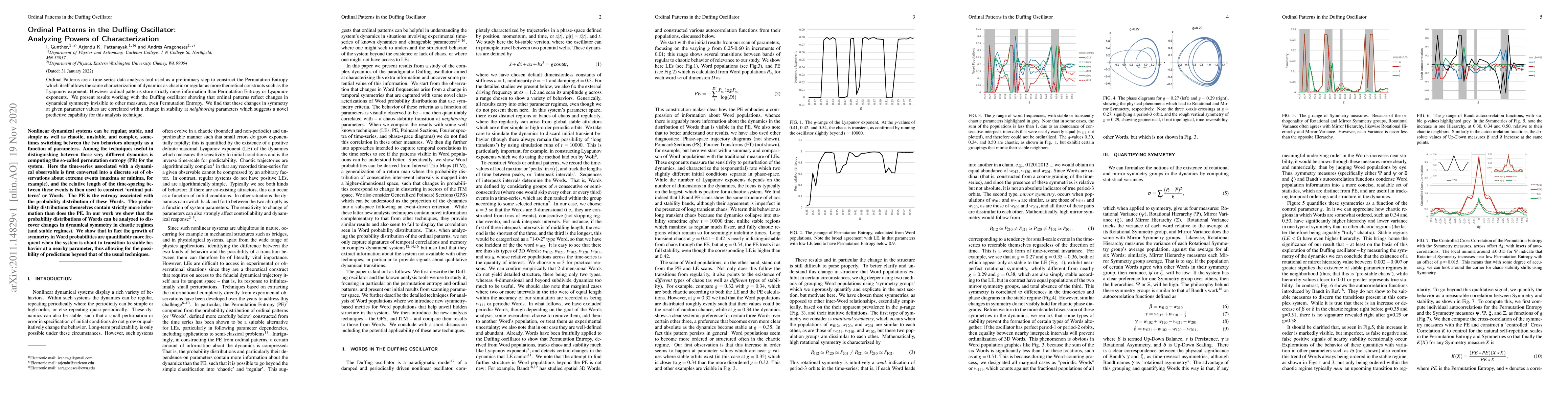 The study investigates how ordinal patterns offer a more nuanced characterization of dynamics in the Duffing oscillator, detecting changes in dynamical symmetry not visible to other measures like Permutation Entropy or Lyapunov exponents. The findings suggest ordinal patterns have predictive power for stability changes in the system.