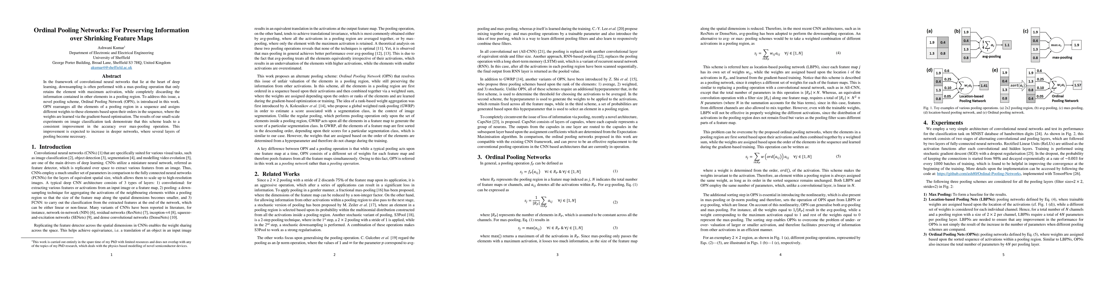 This research introduces Ordinal Pooling Networks (OPN), a novel pooling scheme for convolutional neural networks that preserves information from all elements in a pooling region, unlike traditional max-pooling. Small-scale image classification experiments show OPN consistently improves accuracy over max-pooling, with expected benefits increasing in deeper networks.