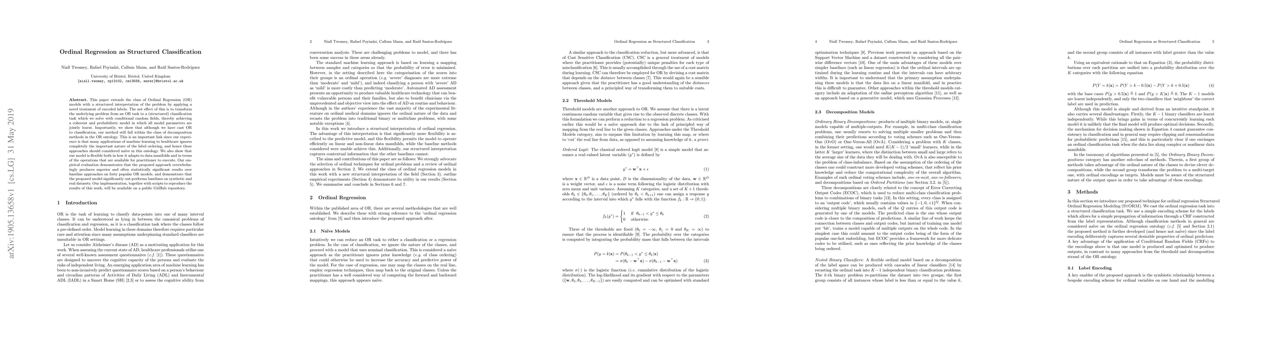 This paper proposes a structured classification approach for ordinal regression, transforming it into a classification task using conditional random fields, which outperforms baseline methods on various datasets. The method maintains the label ordering and is flexible for different data adaptations.