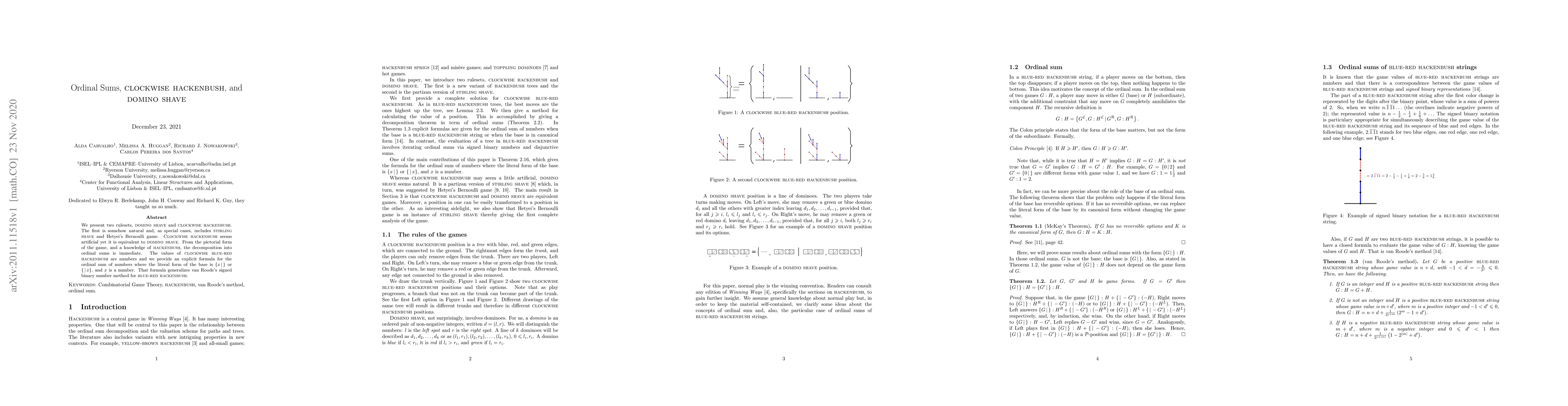 This paper introduces Domino Shave and Clockwise Hackenbush, two seemingly different game rulesets that are equivalent. The authors provide a formula for the ordinal sum of numbers in Clockwise Blue-Red Hackenbush, generalizing van Roode's method for Blue-Red Hackenbush.