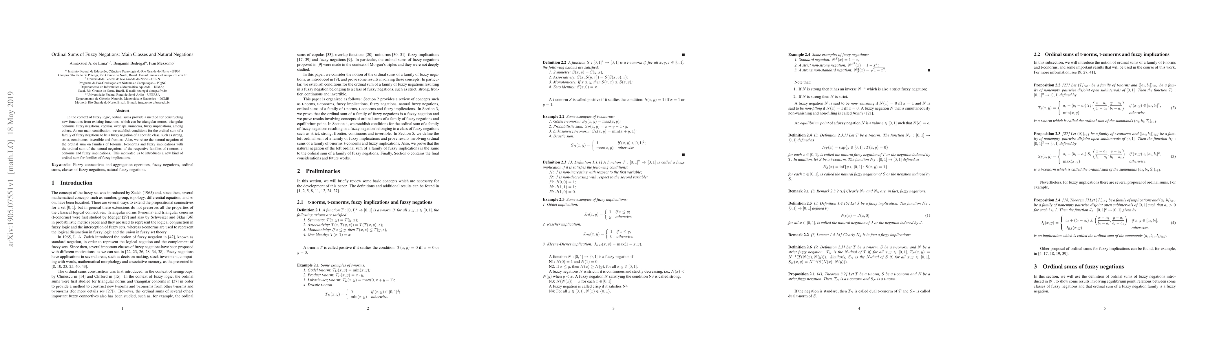 This paper explores the construction of new fuzzy logic functions via ordinal sums, focusing on conditions under which the ordinal sum of fuzzy negations retains specific properties. It also establishes a relationship between the natural negation of ordinal sums and the ordinal sum of natural negations, introducing a new ordinal sum for fuzzy implications.