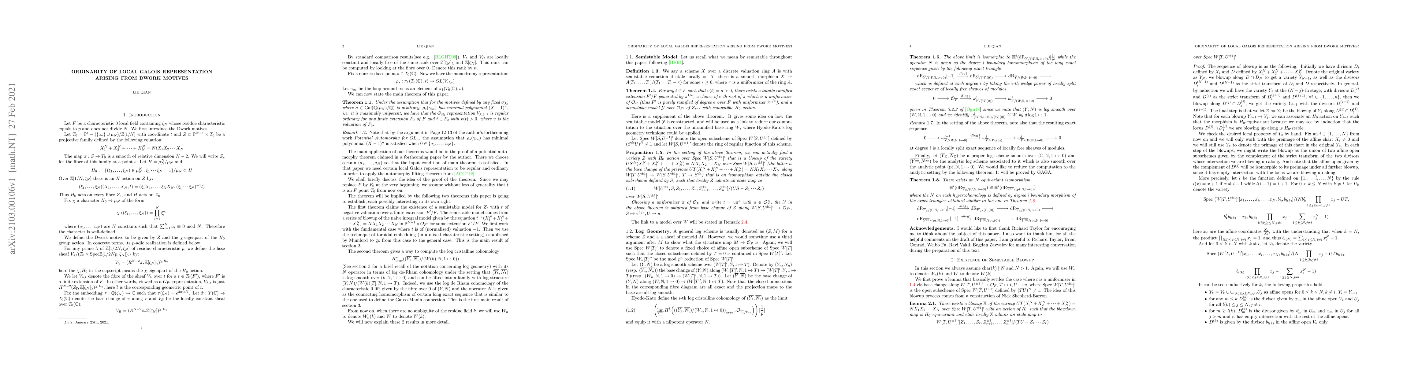 In this paper, we prove that for suitably chosen Dwork motives, the local Galois representation arising from middle cohomology of fibers over a point with $p$-adic valuation $<0$ on the base is regular and ordinary. The result will be crucial in the forthcoming work Potential Automorphy for $GL_n$. The proof consists of the construction of a semistable blowup and a use of Hyodo-Kato's log crystalline cohomology theory.