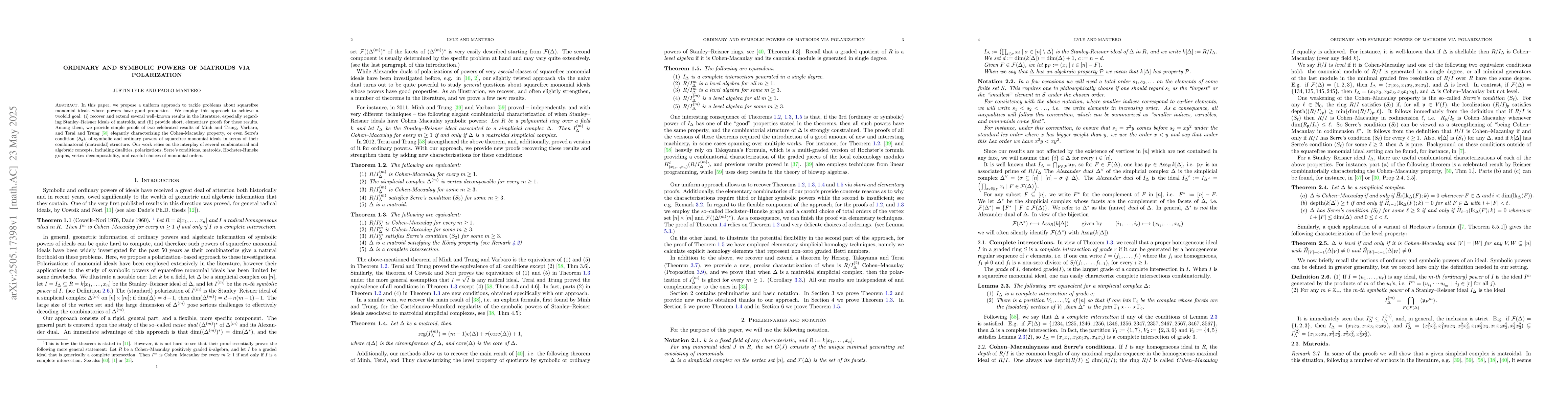The paper presents a novel combinatorial-algebraic framework for analyzing matroids via polarization, leading to simplified proofs of significant results concerning ordinary and symbolic powers of monomial ideals.