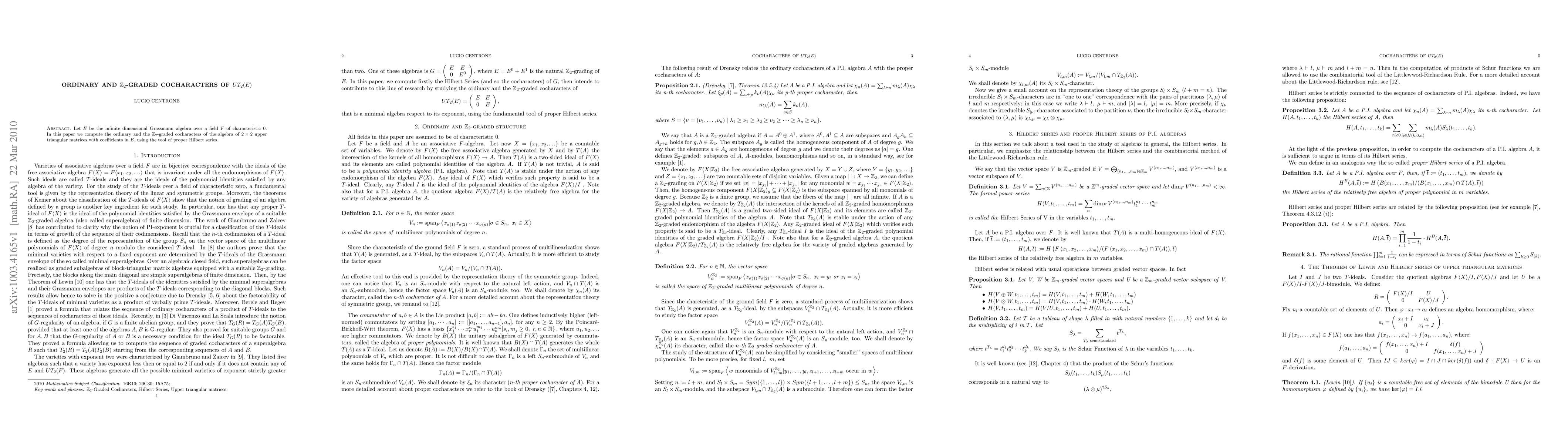 Researchers computed cocharacters for 2x2 upper triangular matrices with coefficients in infinite dimensional Grassmann algebra over a field F of characteristic 0, using proper Hilbert series.