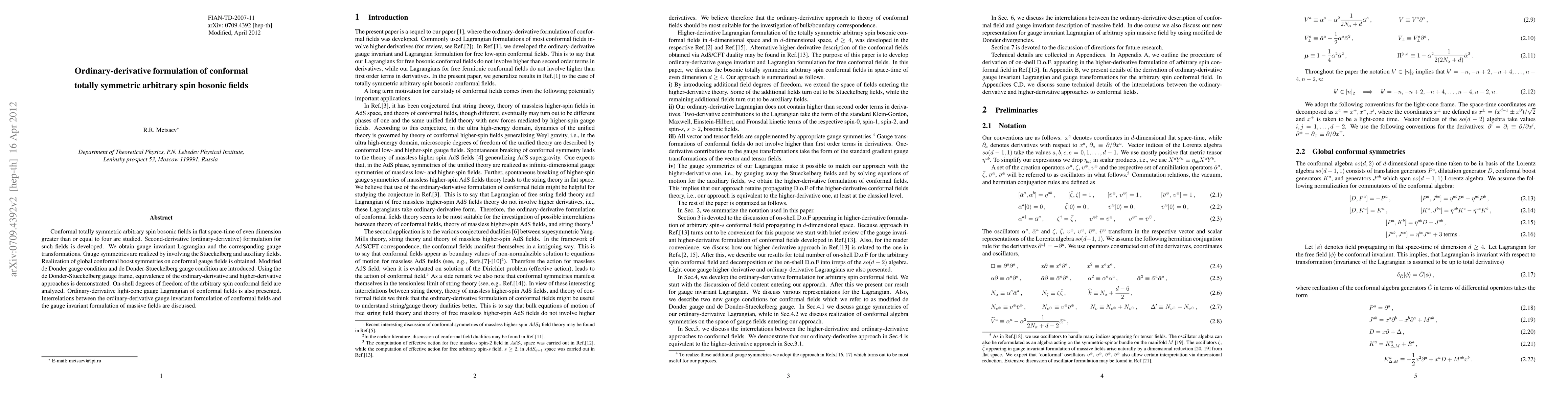 This paper develops an ordinary-derivative formulation for conformal totally symmetric arbitrary spin bosonic fields in even-dimensional flat space-time, introducing gauge invariant Lagrangians and transformations. It demonstrates equivalence between ordinary-derivative and higher-derivative approaches using the de Donder-Stueckelberg gauge.