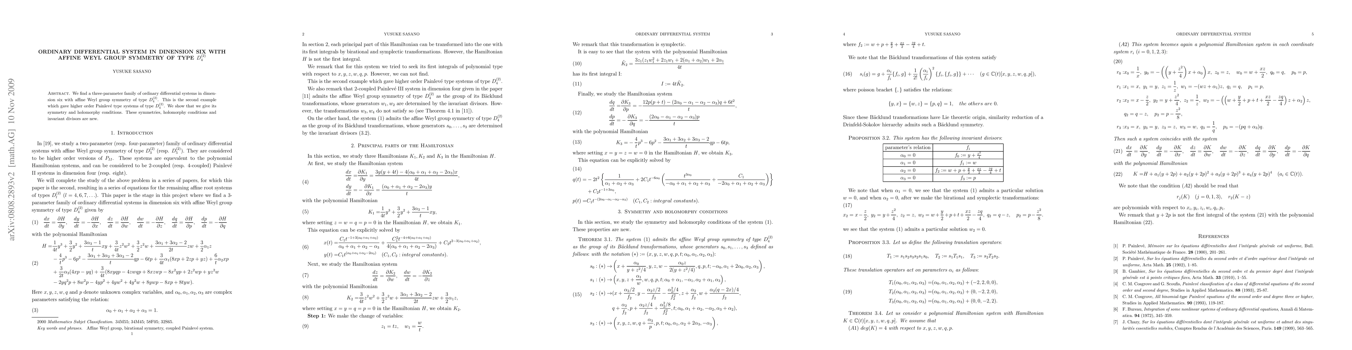 Researchers found a three-parameter family of ordinary differential systems in 6 dimensions with D4^(2) affine Weyl group symmetry, providing new examples of higher-order Painlevé type systems.