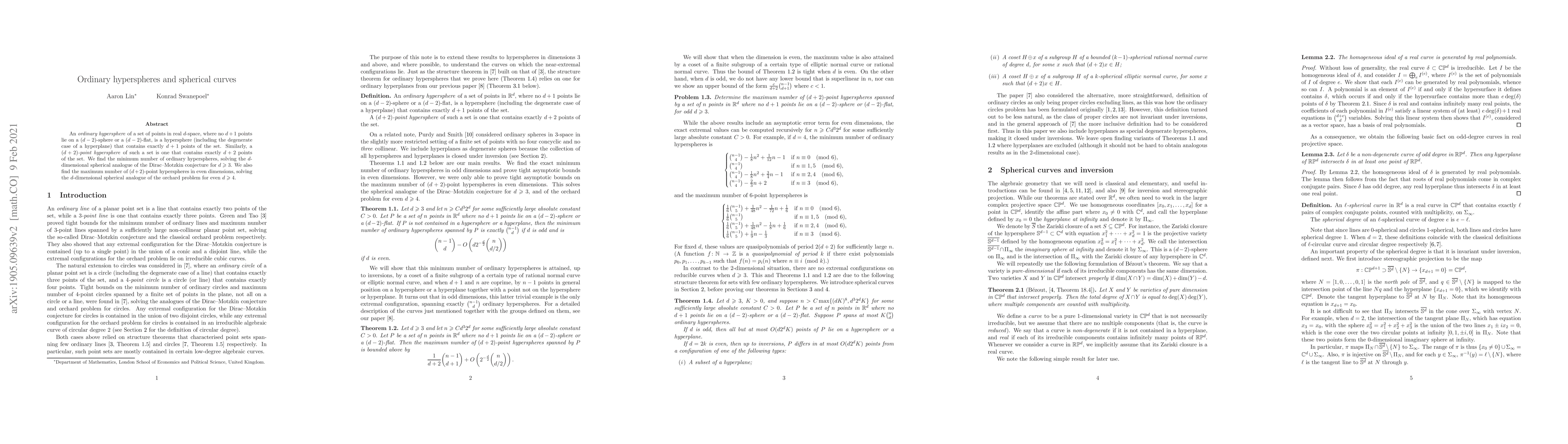 An ordinary hypersphere of a set of points in real $d$-space, where no $d+1$ points lie on a $(d-2)$-sphere or a $(d-2)$-flat, is a hypersphere (including the degenerate case of a hyperplane) that contains exactly $d+1$ points of the set. Similarly, a $(d+2)$-point hypersphere of such a set is one that contains exactly $d+2$ points of the set. We find the minimum number of ordinary hyperspheres, solving the $d$-dimensional spherical analogue of the Dirac--Motzkin conjecture for $d \geqslant 3$. We also find the maximum number of $(d+2)$-point hyperspheres in even dimensions, solving the $d$-dimensional spherical analogue of the orchard problem for even $d \geqslant 4$.
