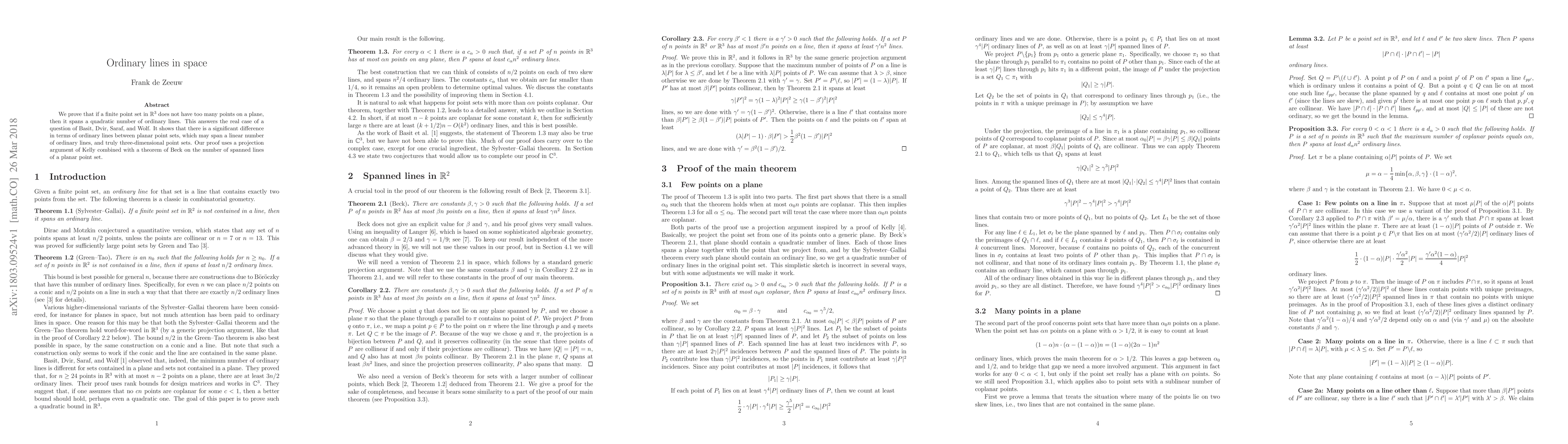 This paper proves that a finite point set in three-dimensional space, with few points lying on any plane, spans a quadratic number of ordinary lines, contrasting with planar sets that span a linear number. The proof integrates Kelly's projection argument and Beck's theorem on planar point sets.