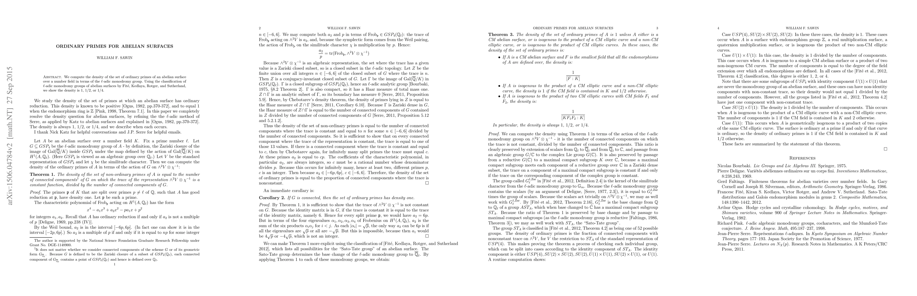 This paper calculates the proportion of 'ordinary primes' for abelian surfaces over number fields, leveraging the classification of l-adic monodromy groups. It establishes that these densities are either 1, 1/2, or 1/4.
