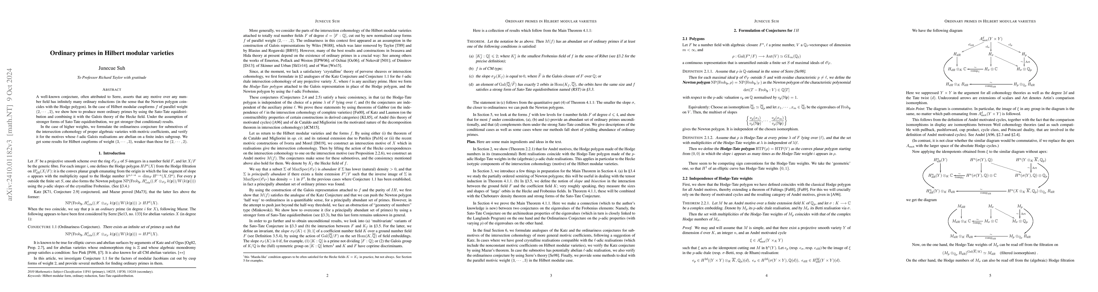 This paper explores the conjecture that motives over number fields have infinitely many ordinary reductions, focusing on Hilbert modular cuspforms of parallel weight $(2, \cdots , 2)$. It uses Sato-Tate equidistribution and Galois theory to produce more ordinary primes and verifies the ordinariness conjecture for certain submotives of intersection cohomology under specific conditions.