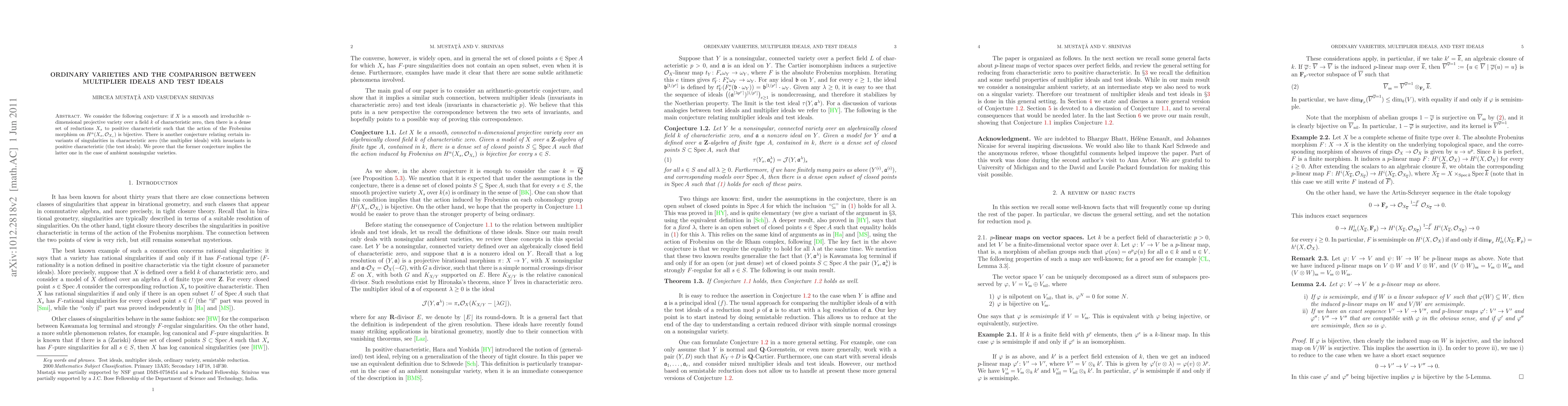 We consider the following conjecture: if X is a smooth projective variety over a field of characteristic zero, then there is a dense set of reductions X_s of X to positive characteristic such that the action of the Frobenius morphism on the top Zariski cohomology of the structure sheaf of X_s is bijective. We also consider a conjecture relating certain invariants of singularities in characteristic zero (the multiplier ideals) with invariants in positive characteristic (the test ideals). We prove that the former conjecture implies the latter one in the case of ambient nonsingular varieties.