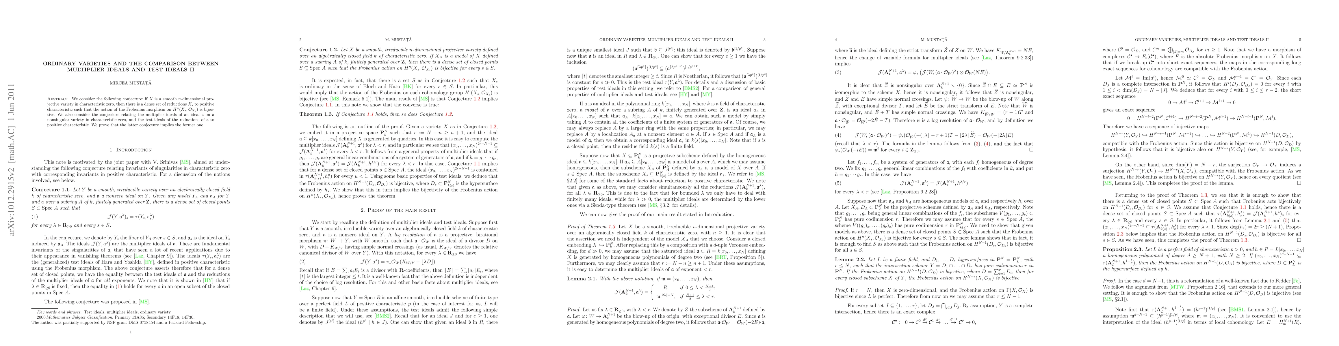 We consider the following conjecture: if X is a smooth projective variety over a field of characteristic zero, then there is a dense set of reductions X_s to positive characteristic such that the action of the Frobenius morphism on the top Zariski cohomology of the structure sheaf on X_s is bijective. We also consider the conjecture relating the multiplier ideals of an ideal J on a nonsingular variety in characteristic zero, and the test ideals of the reductions of J to positive characteristic. We prove that the latter conjecture implies the former one. The converse was proved in a joint paper of the author with V. Srinivas.