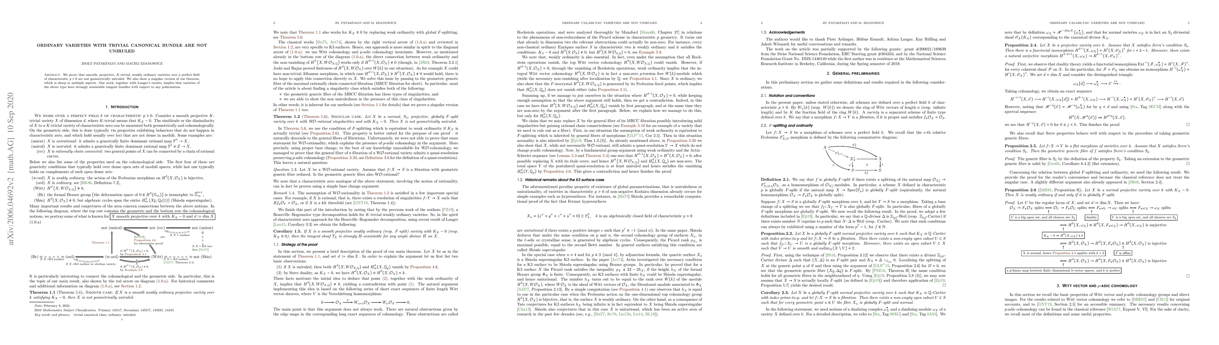We prove that smooth, projective, $K$-trivial, weakly ordinary varieties over a perfect field of characteristic $p>0$ are not geometrically uniruled. We also show a singular version of our theorem, which is sharp in multiple aspects. Our work, together with Langer's results, implies that varieties of the above type have strongly semistable tangent bundles with respect to any polarization.