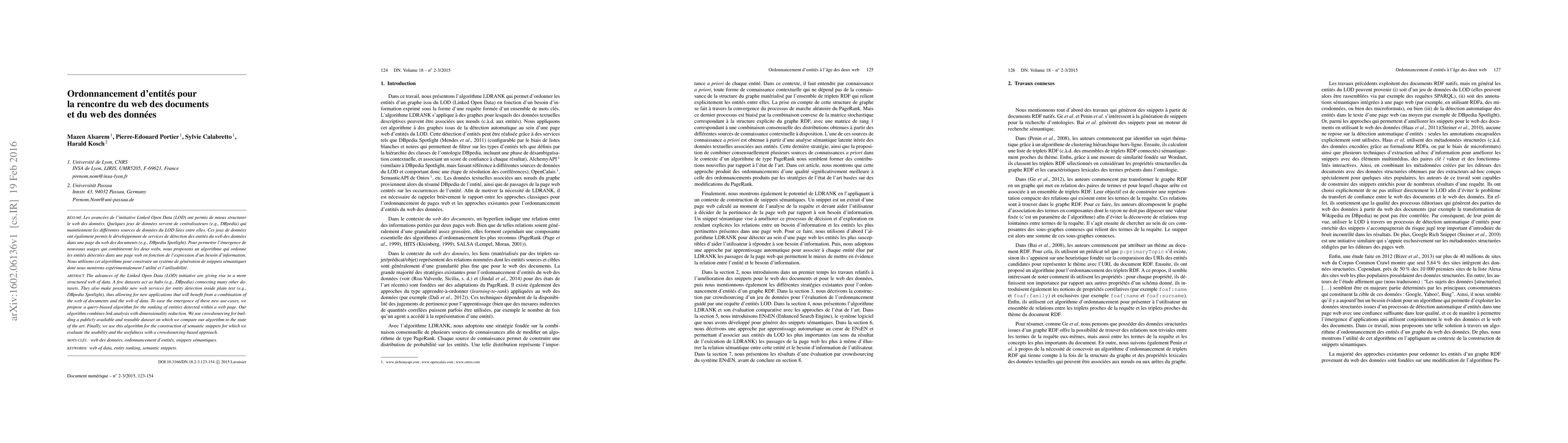 The advances of the Linked Open Data (LOD) initiative are giving rise to a more structured web of data. Indeed, a few datasets act as hubs (e.g., DBpedia) connecting many other datasets. They also made possible new web services for entity detection inside plain text (e.g., DBpedia Spotlight), thus allowing for new applications that will benefit from a combination of the web of documents and the web of data. To ease the emergence of these new use-cases, we propose a query-biased algorithm for the ranking of entities detected inside a web page. Our algorithm combine link analysis with dimensionality reduction. We use crowdsourcing for building a publicly available and reusable dataset on which we compare our algorithm to the state of the art. Finally, we use this algorithm for the construction of semantic snippets for which we evaluate the usability and the usefulness with a crowdsourcing-based approach.