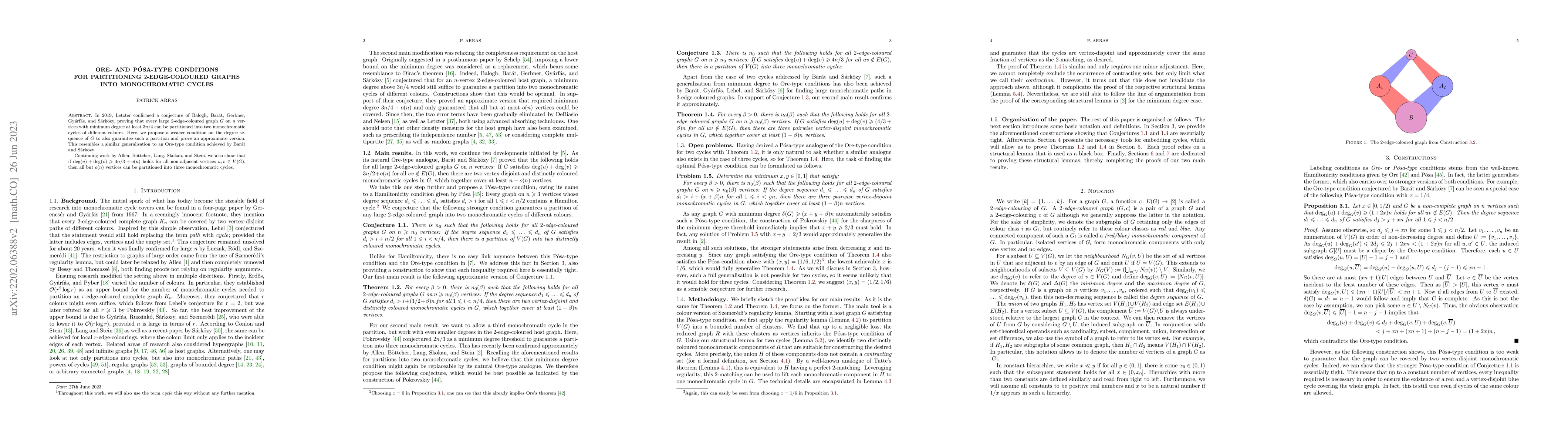 This paper proposes a weaker degree condition for partitioning large $2$-edge-coloured graphs into two monochromatic cycles, generalizing an Ore-type condition. It also proves that a similar condition can partition nearly all vertices into three monochromatic cycles.