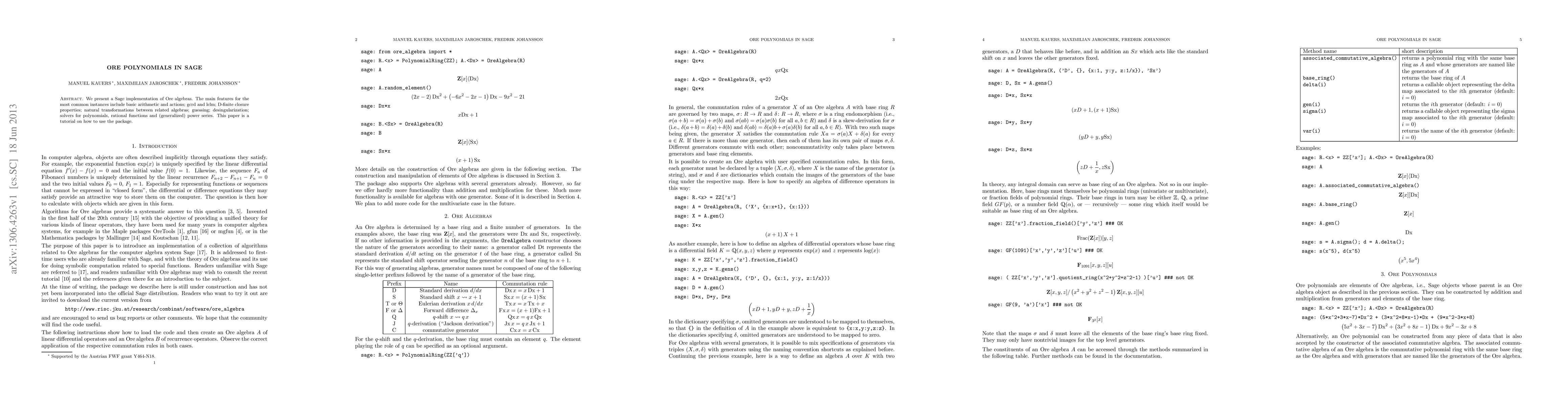 The paper presents a Sage implementation of Ore algebras, detailing features such as basic arithmetic, actions, gcrd and lclm, D-finite closure properties, natural transformations, guessing, desingularization, and solvers for polynomials, rational functions, and (generalized) power series.
