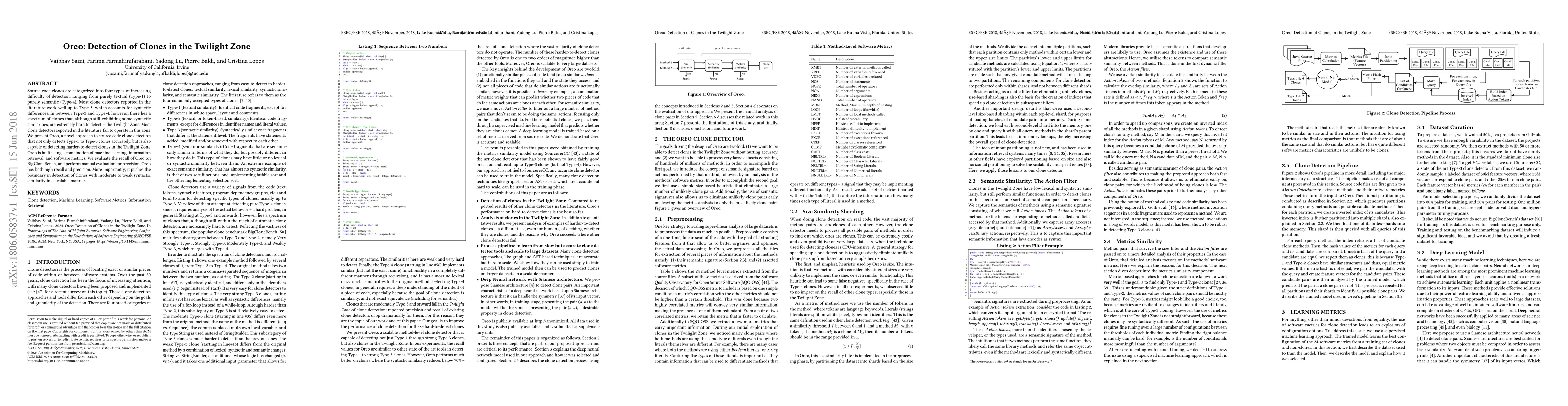 Oreo is a novel clone detection approach that accurately identifies clones up to Type-3 and effectively detects clones in the challenging "Twilight Zone" between Type-3 and Type-4. It employs machine learning, information retrieval, and software metrics, demonstrating high recall and precision in evaluations.