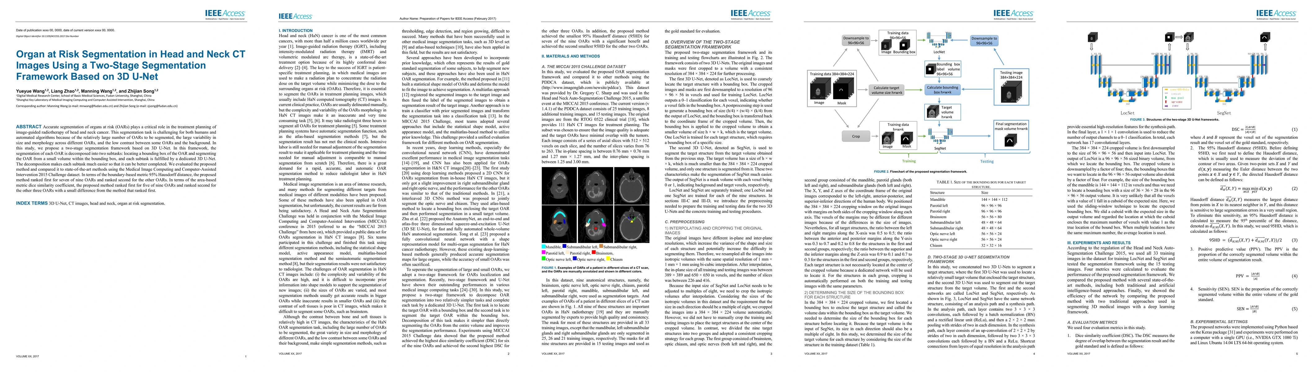 This research presents a two-stage segmentation framework using 3D U-Net for accurate Organ at Risk (OAR) identification in head and neck CT images, crucial for radiation treatment planning. The method decomposes OAR segmentation into locating a bounding box and segmenting the OAR within it, outperforming state-of-the-art techniques in MICCAI 2015 Challenge dataset with high rankings in boundary-based and area-based metrics.