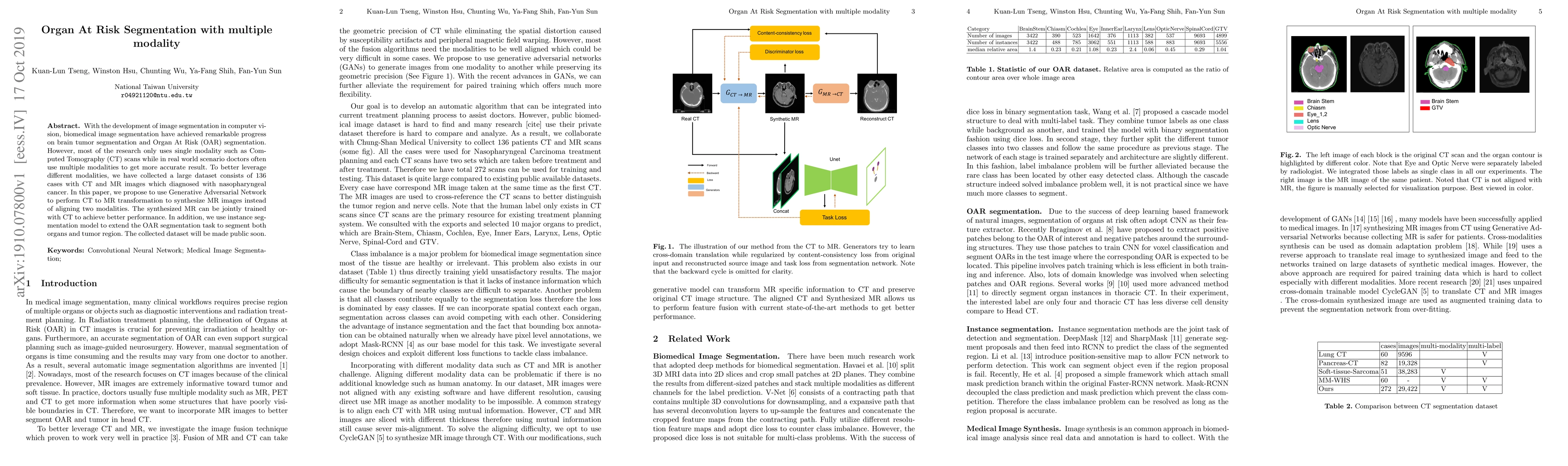 With the development of image segmentation in computer vision, biomedical image segmentation have achieved remarkable progress on brain tumor segmentation and Organ At Risk (OAR) segmentation. However, most of the research only uses single modality such as Computed Tomography (CT) scans while in real world scenario doctors often use multiple modalities to get more accurate result. To better leverage different modalities, we have collected a large dataset consists of 136 cases with CT and MR images which diagnosed with nasopharyngeal cancer. In this paper, we propose to use Generative Adversarial Network to perform CT to MR transformation to synthesize MR images instead of aligning two modalities. The synthesized MR can be jointly trained with CT to achieve better performance. In addition, we use instance segmentation model to extend the OAR segmentation task to segment both organs and tumor region. The collected dataset will be made public soon.