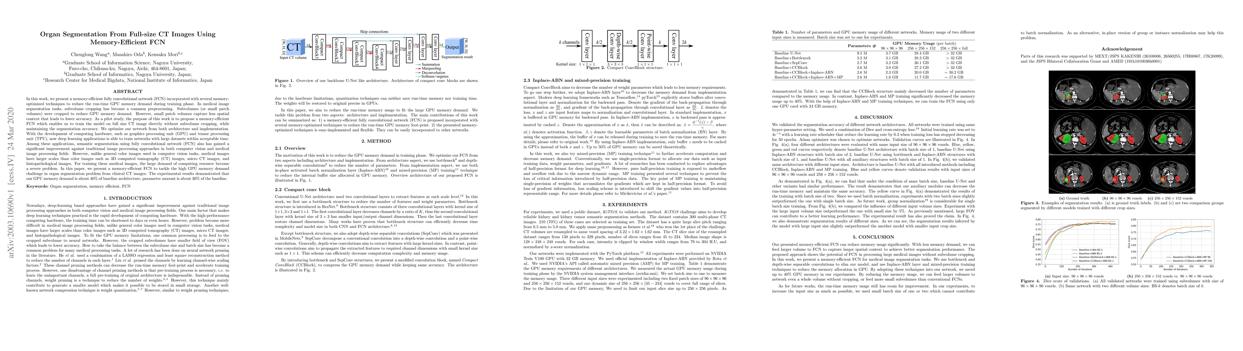 In this work, we present a memory-efficient fully convolutional network (FCN) incorporated with several memory-optimized techniques to reduce the run-time GPU memory demand during training phase. In medical image segmentation tasks, subvolume cropping has become a common preprocessing. Subvolumes (or small patch volumes) were cropped to reduce GPU memory demand. However, small patch volumes capture less spatial context that leads to lower accuracy. As a pilot study, the purpose of this work is to propose a memory-efficient FCN which enables us to train the model on full size CT image directly without subvolume cropping, while maintaining the segmentation accuracy. We optimize our network from both architecture and implementation. With the development of computing hardware, such as graphics processing unit (GPU) and tensor processing unit (TPU), now deep learning applications is able to train networks with large datasets within acceptable time. Among these applications, semantic segmentation using fully convolutional network (FCN) also has gained a significant improvement against traditional image processing approaches in both computer vision and medical image processing fields. However, unlike general color images used in computer vision tasks, medical images have larger scales than color images such as 3D computed tomography (CT) images, micro CT images, and histopathological images. For training these medical images, the large demand of computing resource become a severe problem. In this paper, we present a memory-efficient FCN to tackle the high GPU memory demand challenge in organ segmentation problem from clinical CT images. The experimental results demonstrated that our GPU memory demand is about 40% of baseline architecture, parameter amount is about 30% of the baseline.