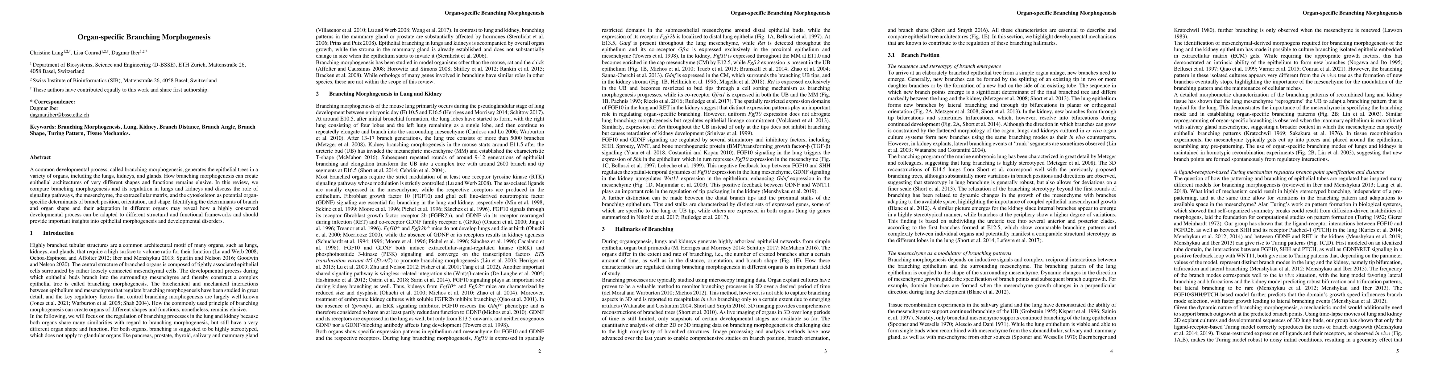 This review explores the regulation and organ-specific determinants of branching morphogenesis in lungs and kidneys, focusing on signaling pathways, mesenchyme, extracellular matrix, and cytoskeleton to understand how this conserved process adapts to diverse shapes and functions. Insights into these adaptations may elucidate epithelial morphogenesis and related developmental disorders.