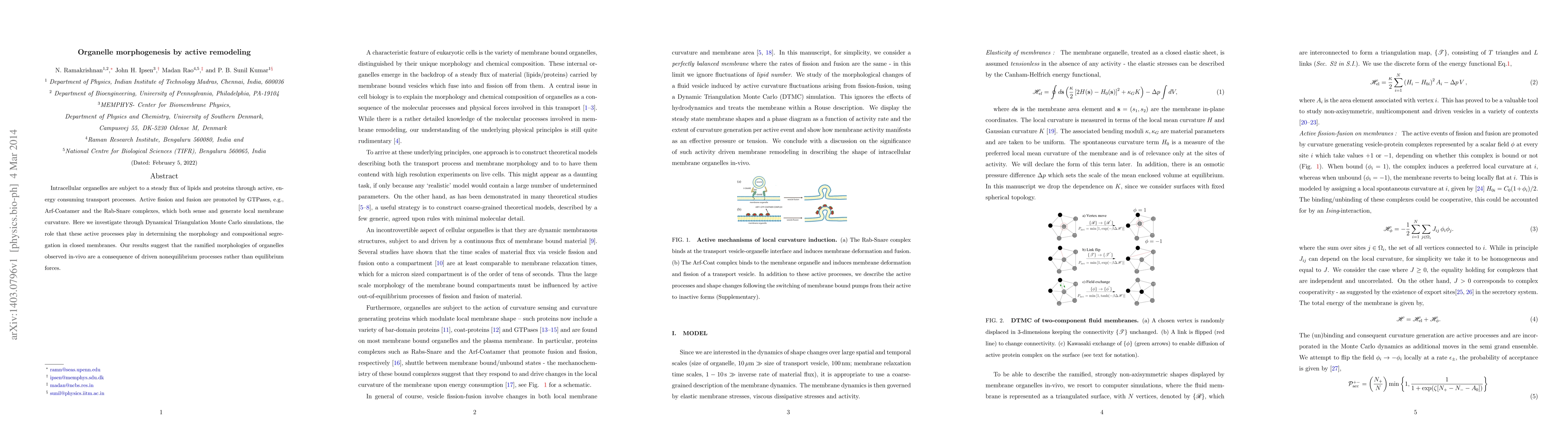 Intracellular organelles are subject to a steady flux of lipids and proteins through active, energy consuming transport processes. Active fission and fusion are promoted by GTPases, e.g., Arf-Coatamer and the Rab-Snare complexes, which both sense and generate local membrane curvature. Here we investigate through Dynamical Triangulation Monte Carlo simulations, the role that these active processes play in determining the morphology and compositional segregation in closed membranes. Our results suggest that the ramified morphologies of organelles observed in-vivo are a consequence of driven nonequilibrium processes rather than equilibrium forces.