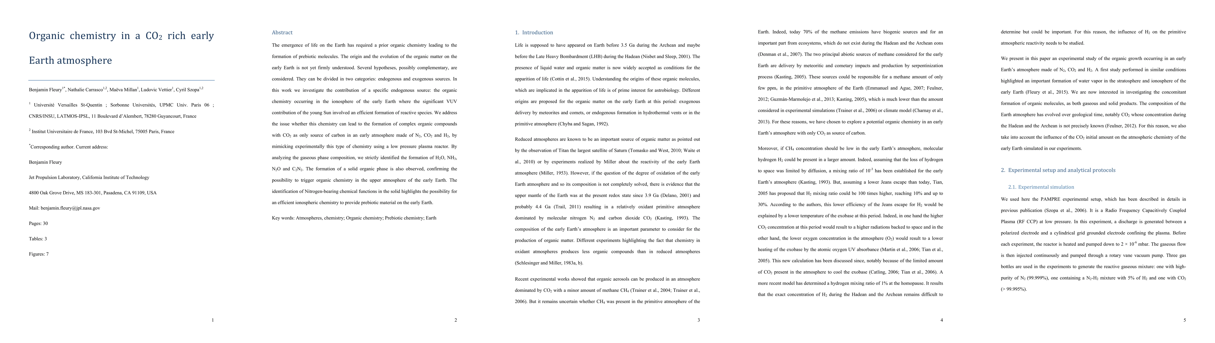 Researchers investigate the formation of organic compounds in a CO2-rich early Earth atmosphere using a low-pressure plasma reactor, discovering complex compounds like H2O, NH3, and C2N2.