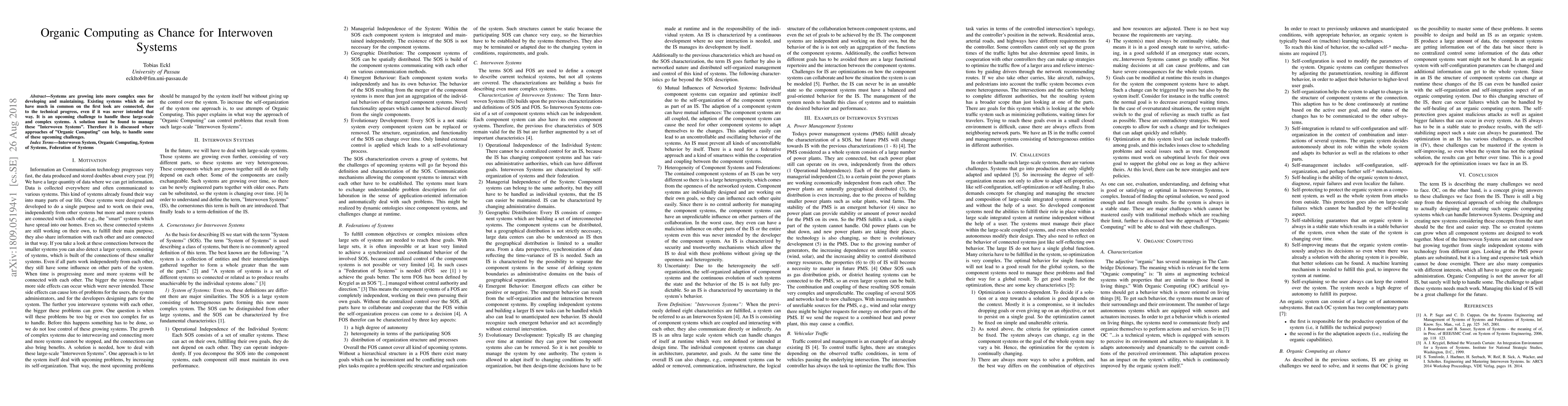 Systems are growing into more complex ones for developing and maintaining. Existing systems which do not have much in common on the first look are connected, due to the technical progress, even if it was never intended that way. It is an upcoming challenge to handle these large-scale and complex systems. A solution must be found to manage these "Interwoven Systems". Therefore it is discussed where approaches of "Organic Computing" can help, to handle some of these upcoming challenges.