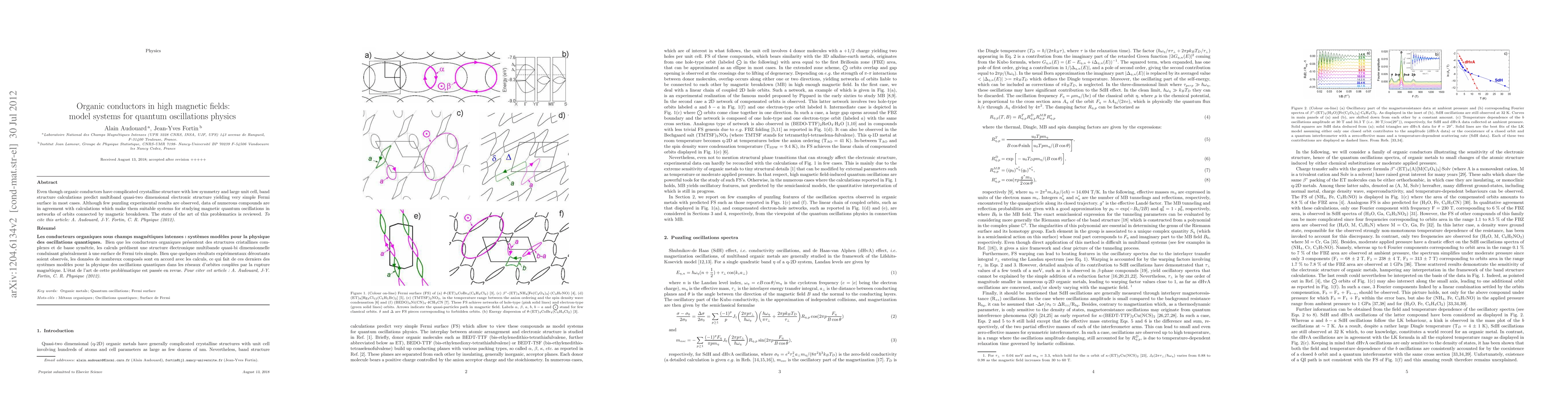 Even though organic conductors have complicated crystalline structure with low symmetry and large unit cell, band structure calculations predict multiband quasi-two dimensional electronic structure yielding very simple Fermi surface in most cases. Although few puzzling experimental results are observed, data of numerous compounds are in agreement with calculations which make them suitable systems for studying magnetic quantum oscillations in networks of orbits connected by magnetic breakdown. The state of the art of this problematics is reviewed.