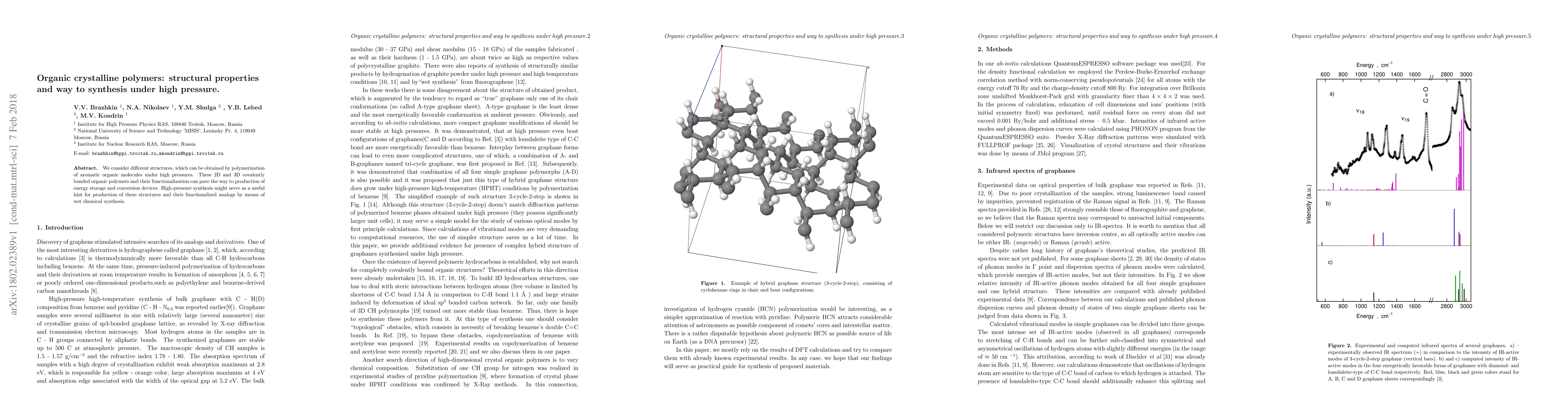 We consider different structures, which can be obtained by polymerization of aromatic organic molecules under high pressures. These 2D and 3D covalently bonded organic polymers and their functionalization can pave the way to production of energy storage and conversion devices. High-pressure synthesis might serve as a useful hint for production of these structures and their functionalized analogs by means of wet chemical synthesis.