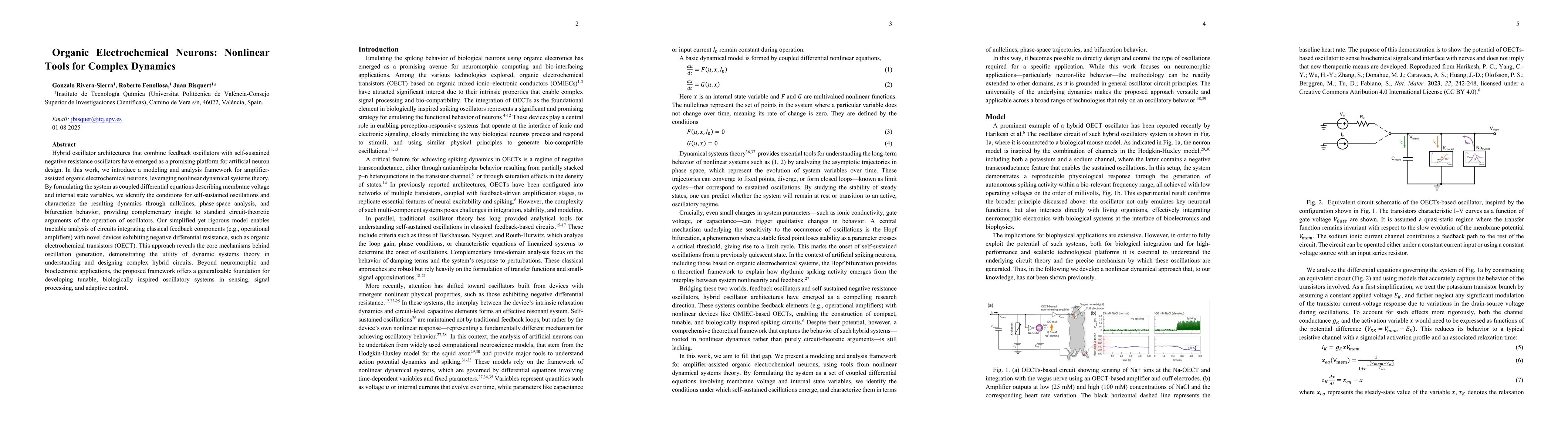 Hybrid oscillator architectures that combine feedback oscillators with self-sustained negative resistance oscillators have emerged as a promising platform for artificial neuron design. In this work, we introduce a modeling and analysis framework for amplifier-assisted organic electrochemical neurons, leveraging nonlinear dynamical systems theory. By formulating the system as coupled differential equations describing membrane voltage and internal state variables, we identify the conditions for self-sustained oscillations and characterize the resulting dynamics through nullclines, phase-space analysis, and bifurcation behavior, providing complementary insight to standard circuit-theoretic arguments of the operation of oscillators. Our simplified yet rigorous model enables tractable analysis of circuits integrating classical feedback components (e.g., operational amplifiers) with novel devices exhibiting negative differential resistance, such as organic electrochemical transistors (OECT). This approach reveals the core mechanisms behind oscillation generation, demonstrating the utility of dynamic systems theory in understanding and designing complex hybrid circuits. Beyond neuromorphic and bioelectronic applications, the proposed framework offers a generalizable foundation for developing tunable, biologically inspired oscillatory systems in sensing, signal processing, and adaptive control.